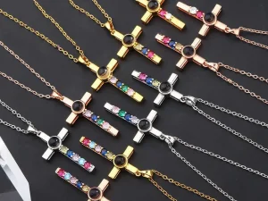 Colorful Diamond Cross Projection In Languages, I Love You Necklace