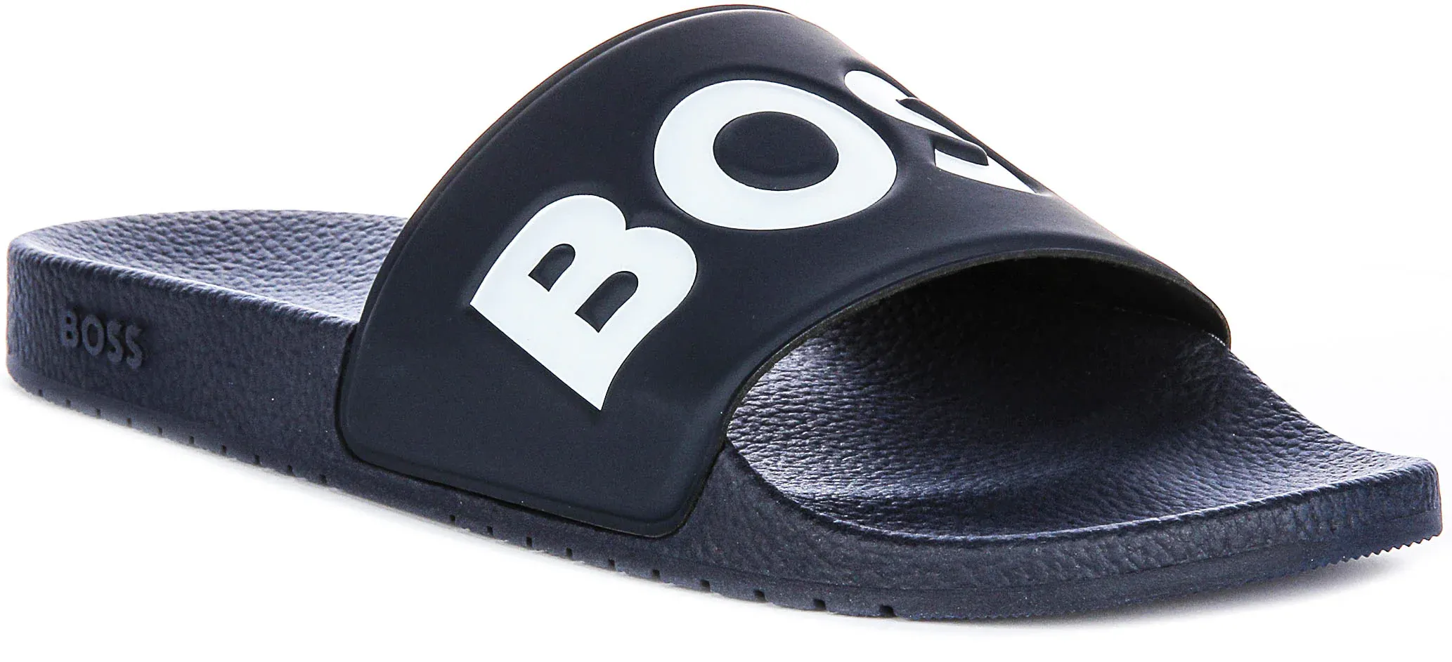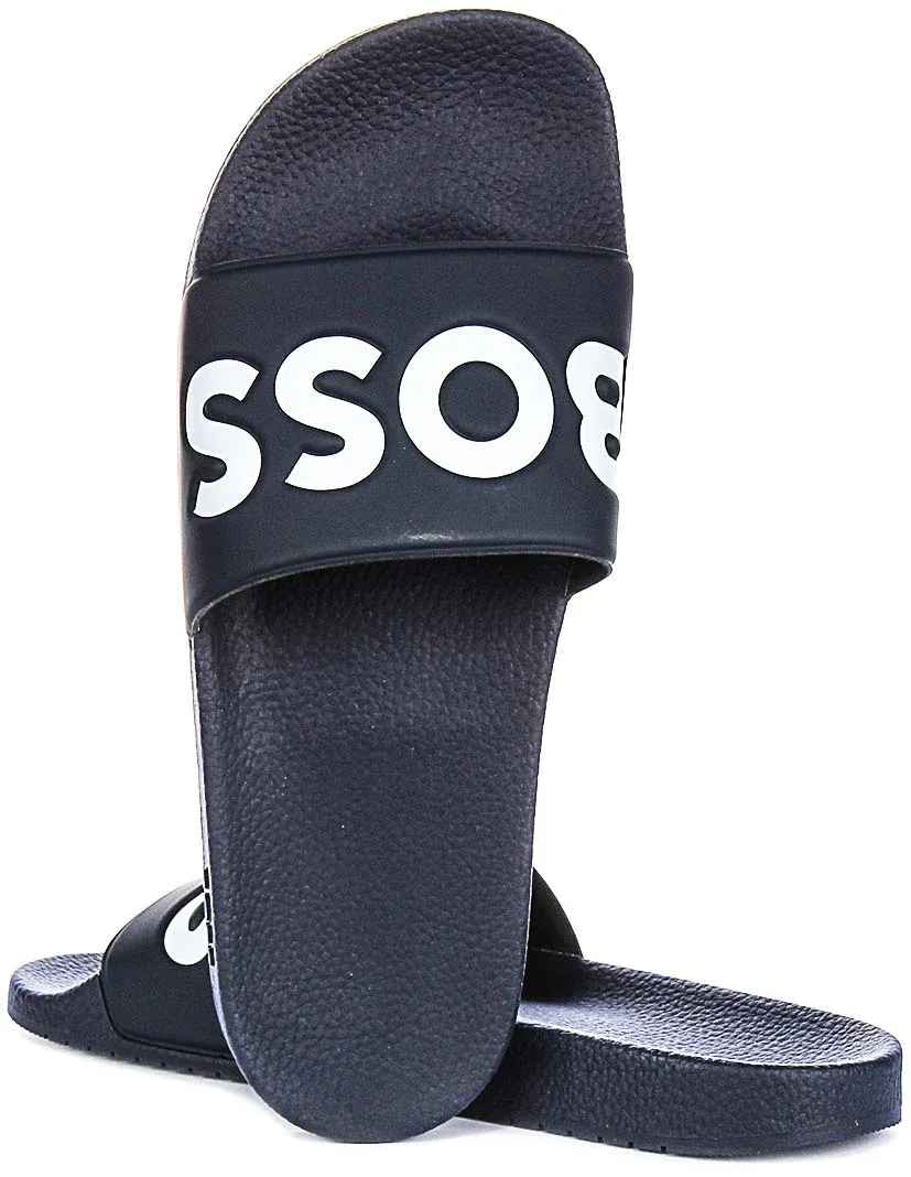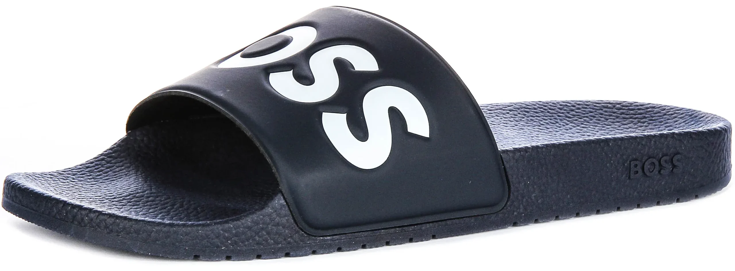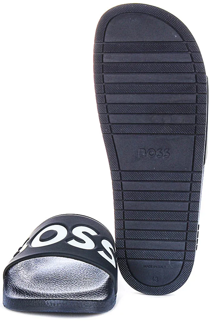 The minimalist yet stylish aesthetic features the bold “BOSS” logo prominently displayed on the wide strap in an eye-catching contrast of white against the black synthetic material. The wide strap ensures a secure and snug fit, supporting your feet without compromising on style. The textured footbed adds additional comfort, providing a soft and cushioned surface for every step.