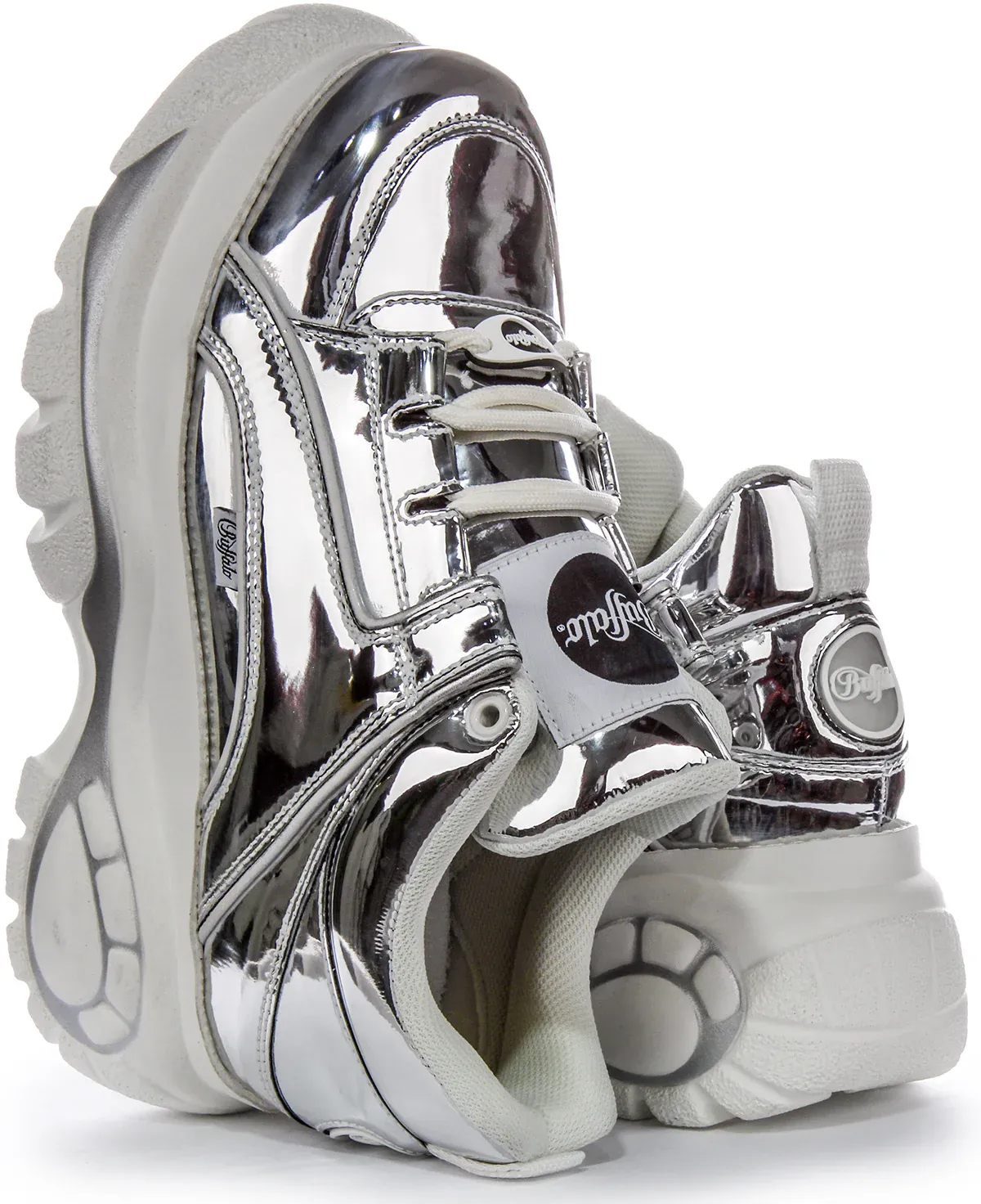 These platforms feature a sleek silver colorway that adds a touch of metallic glamour to your ensemble, while the glossy finish adds shine and sophistication. Crafted from vegan friendly materials, these platforms offer both style and sustainability for the fashion forward individual. The block heel provides stability and elevation, making these platforms perfect for making a statement on any occasion.