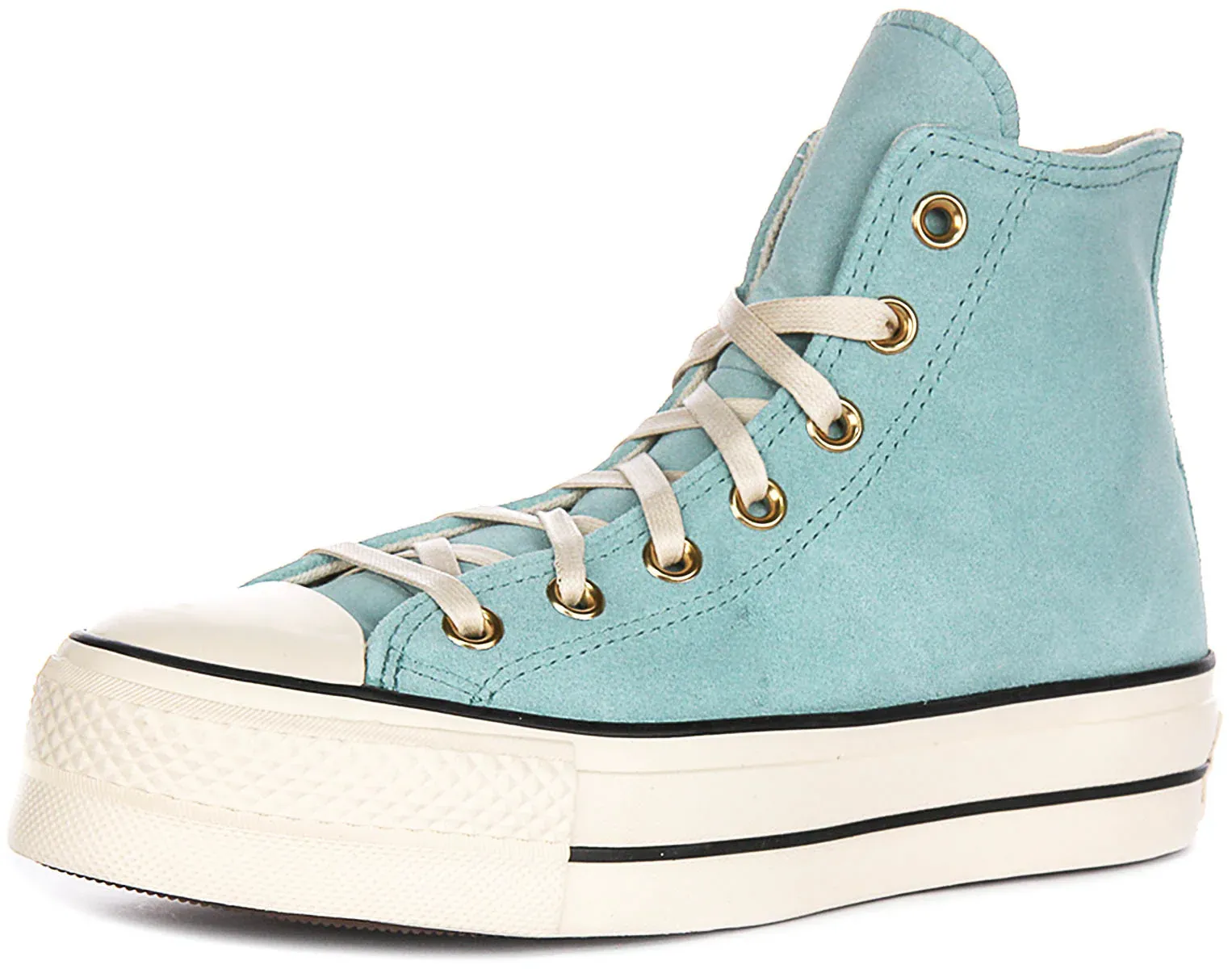 Signature details such as the Converse All Star logo patch on the inner side of the shoe and golden metal eyelets give the design a unique flair. The metallic finish of the eyelets contrasts beautifully with the pastel blue suede, adding a subtle touch of luxury. The trainers are equipped with sturdy white laces, ensuring a snug fit and extended durability.