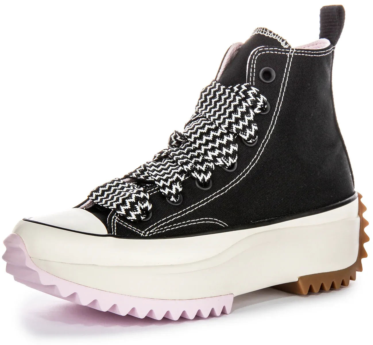 Attention to detail is evident in the houndstooth-patterned laces, adding a touch of sophistication and contrast against the black upper. The iconic Converse All Star logo is positioned prominently on the side, ensuring brand recognition and a nod to the brand’s rich heritage.