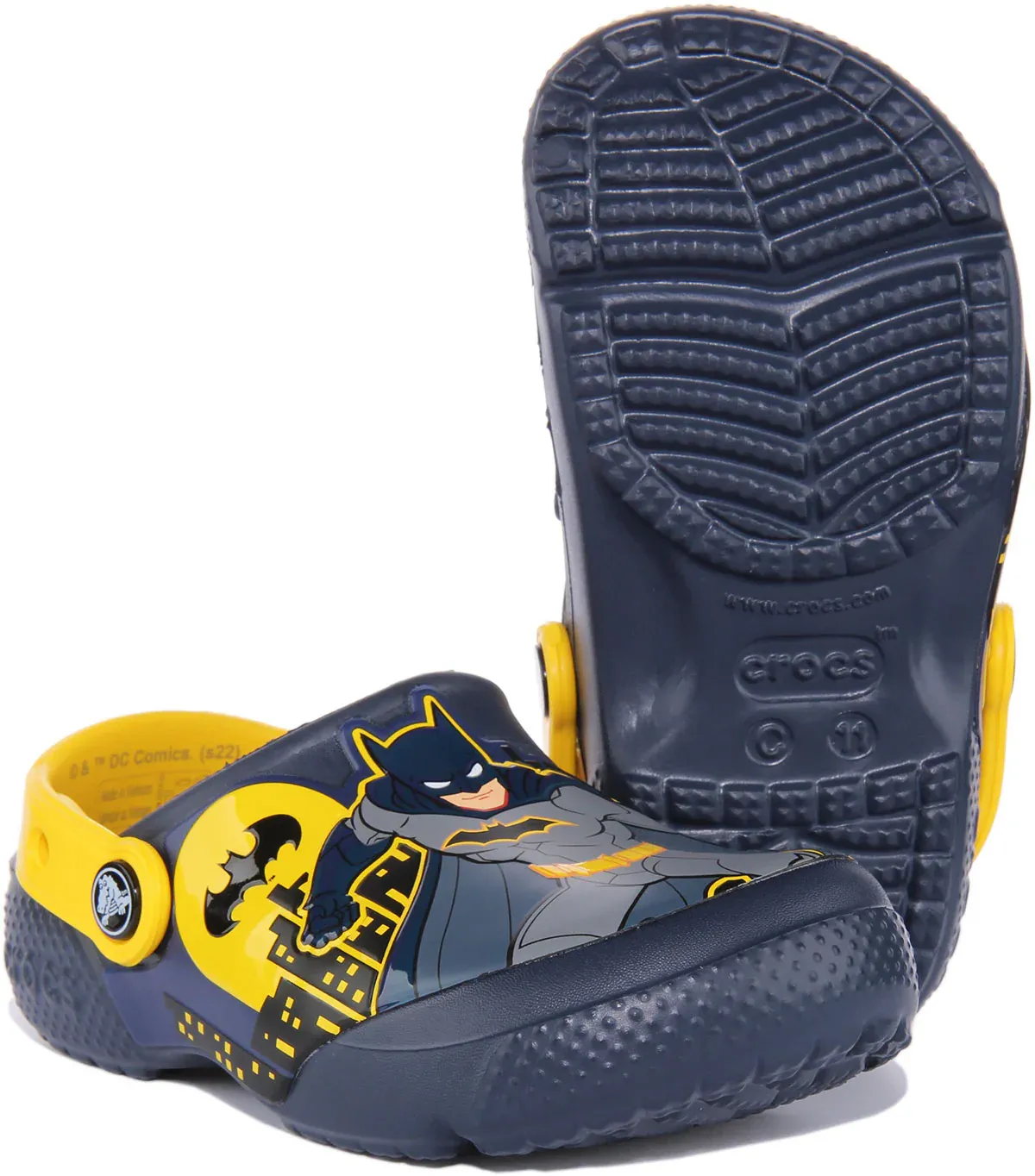 Kids who love Batman will love these clogs from the Crocs Fun Lab, featuring the Batman Patch print on the upper. Incredibly light and fun to wear, these sandals feature Croslite foam outsoles for better traction, support and comfort. Pivoting heel straps offer more secure fit. These clogs are customizable with jibbitz charms. Step into more fun with a new pair from the Fun Lab!
