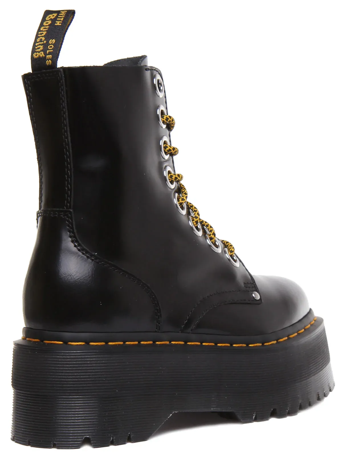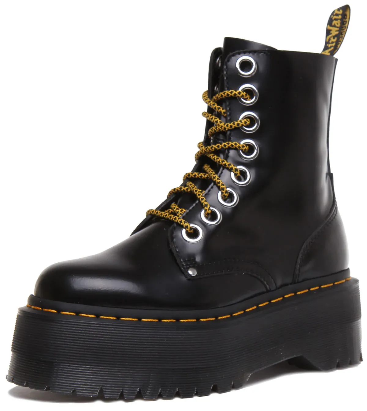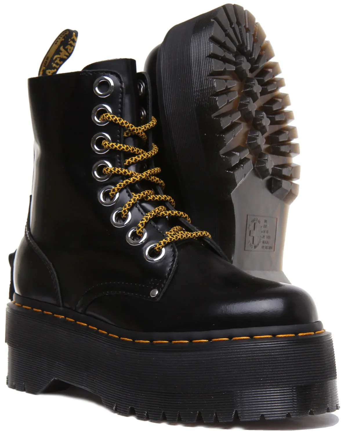 The Dr Martens Jadon Max is kitted out with oversized eyelets and stands on a gravity defying platform sole. These boots are made with Buttero, a full grain smooth leather with textile lining and features lace-up closure and round toe design. The Docs’ DNA completes the boot such as visible welt stitching, an Airwair heel loop and medial side zip. Rubber sole provides excellent grip.
