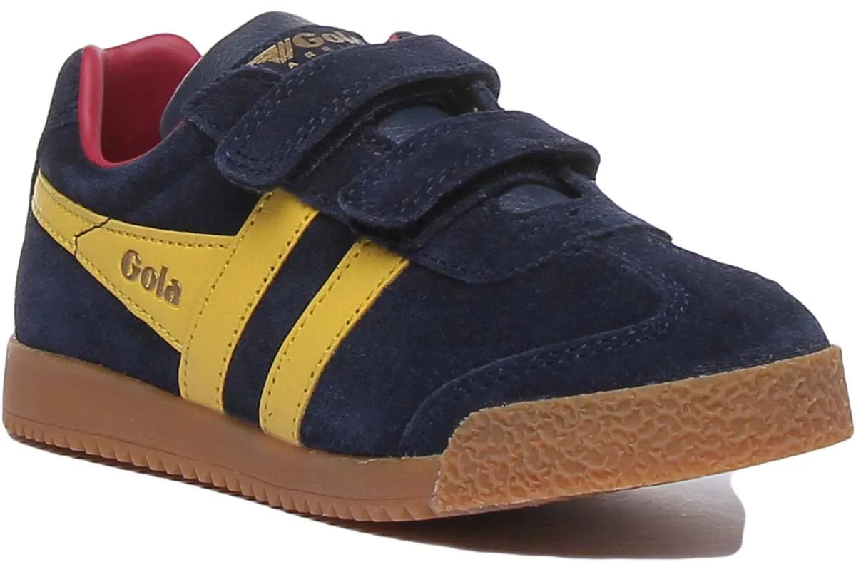 Brighten up your kids day with Gola Harrier Velcro strap sneakers. This low top sneaker features durable suede leather upper with lightly cushioned footbed for all day comfort and Gola branding on the tongue and at the side. They have a durable rubber sole for excellent grip and traction, while the double hook and loop closure ensures secure and adjustable fit.