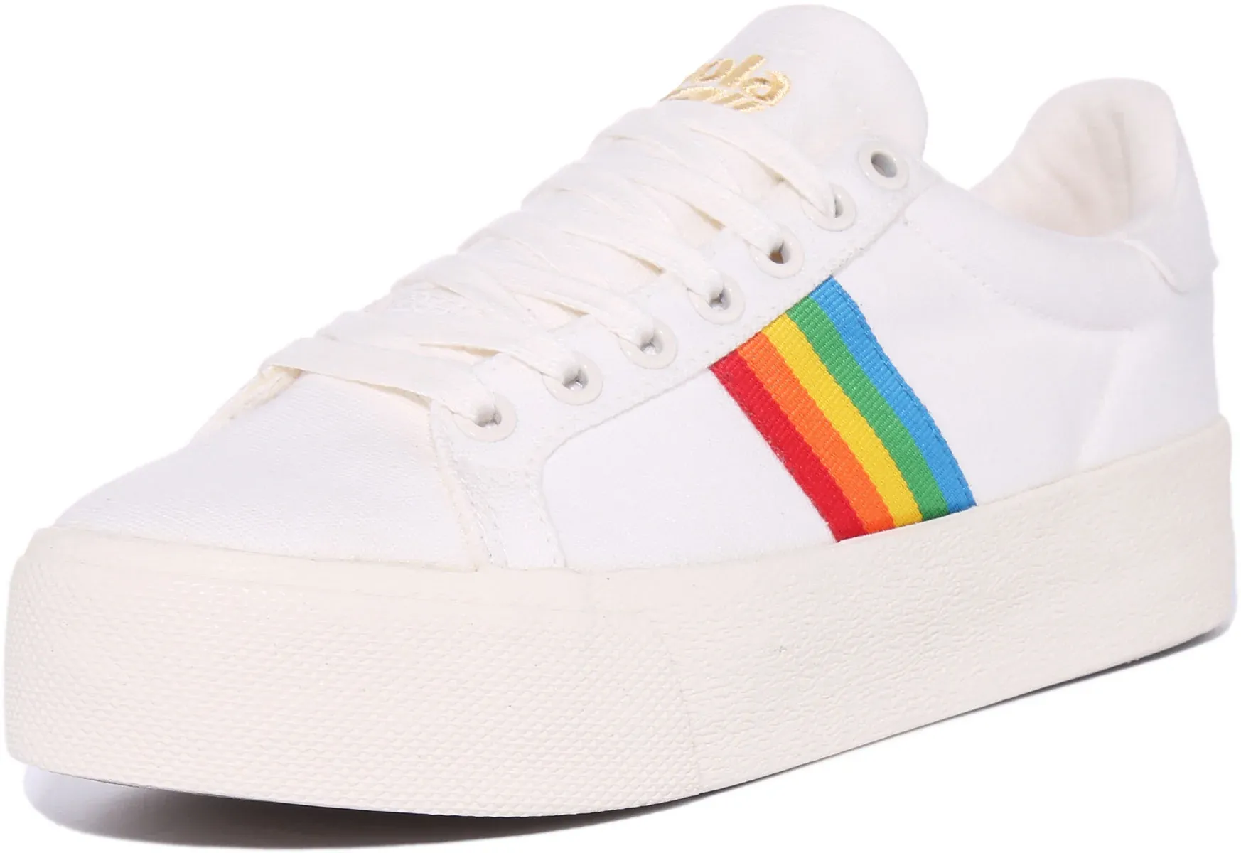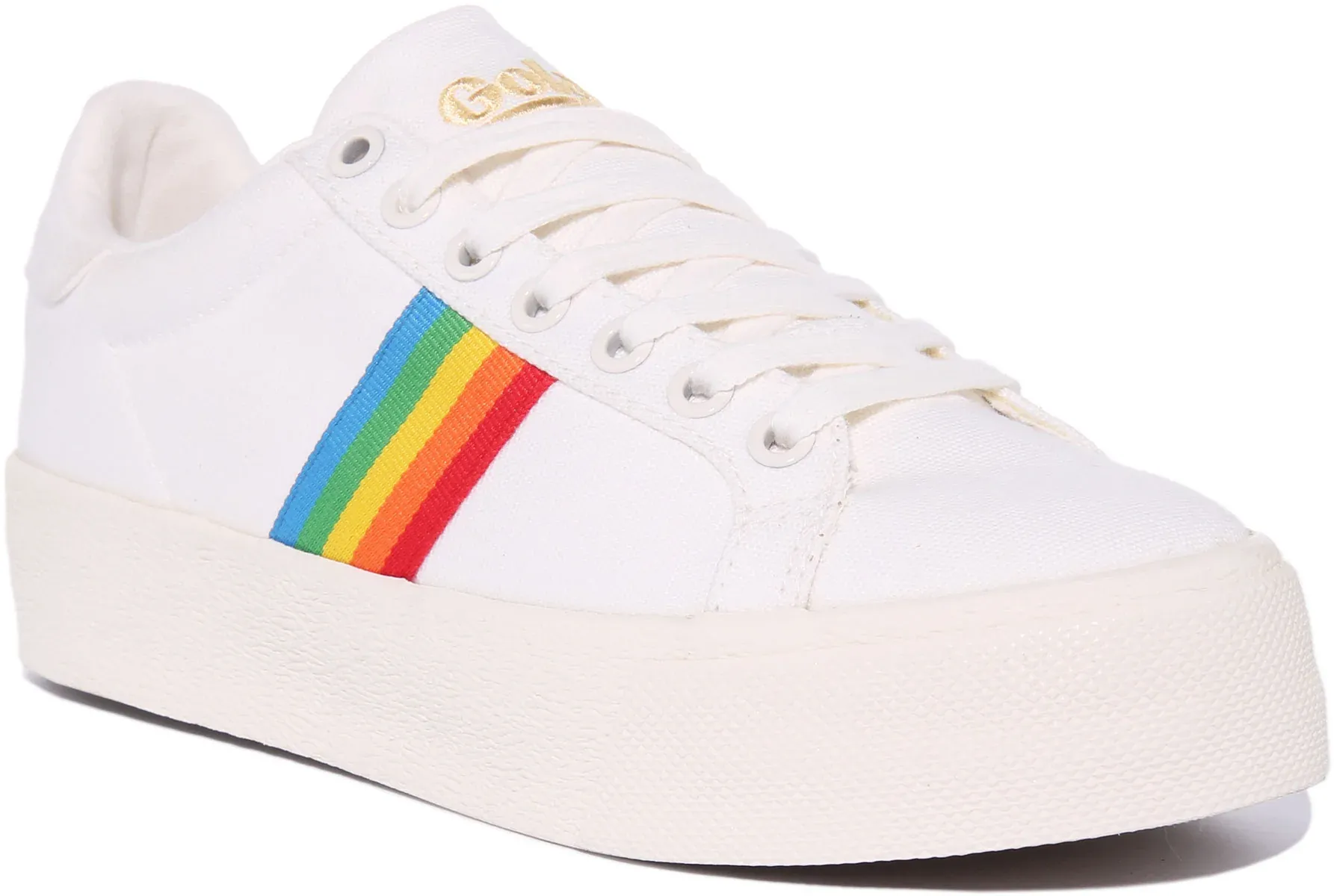 Gola Classics presents the Orchid Platform Rainbow, a new update on the classic platform sneakers. These vegan lace up sneakers have a canvas upper with cheery rainbow stripes on the sides. They have a durable rubber sole for excellent grip and traction. With minimal branding, these crisp canvas sneakers are perfect for any casual occasion.