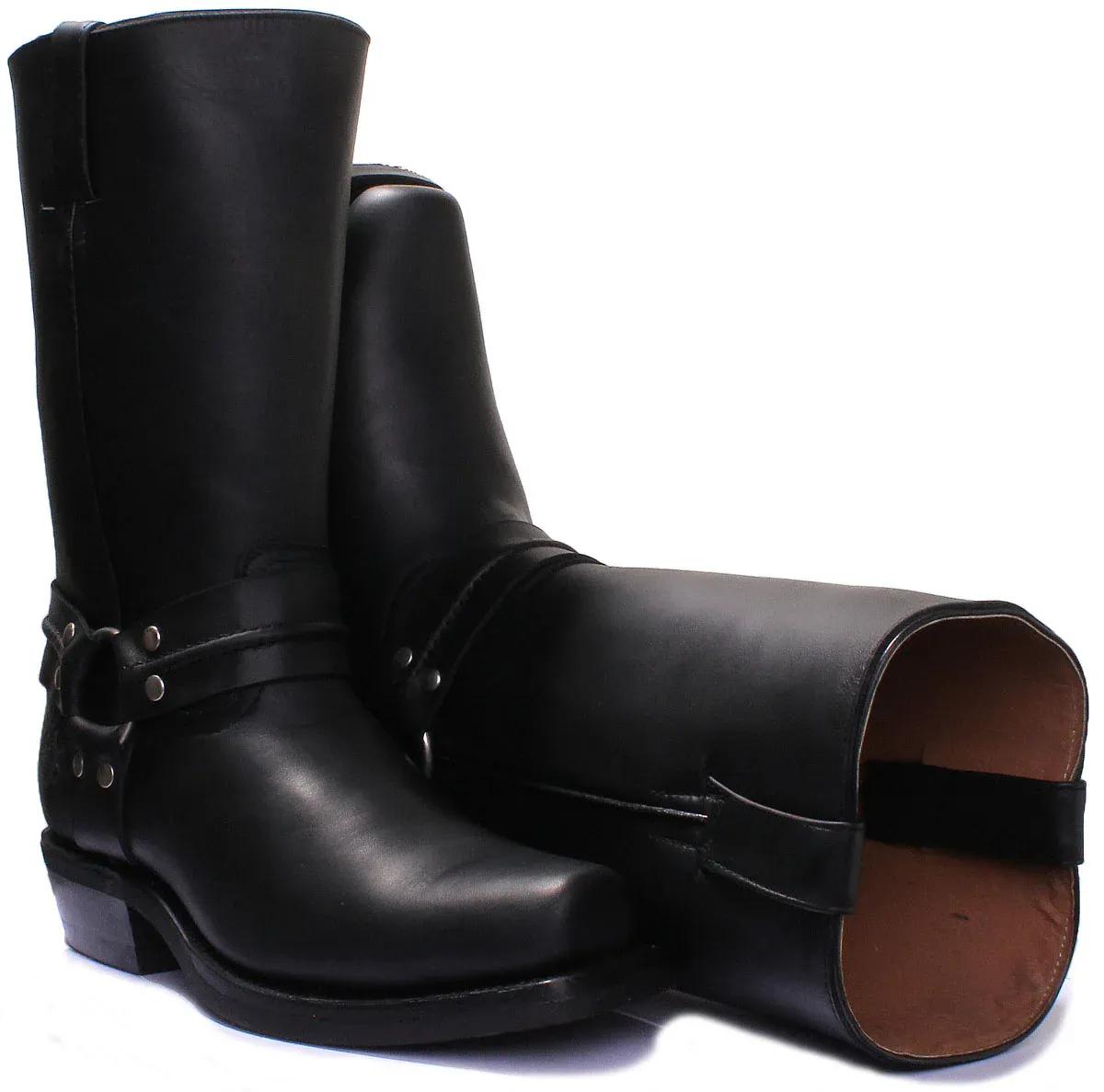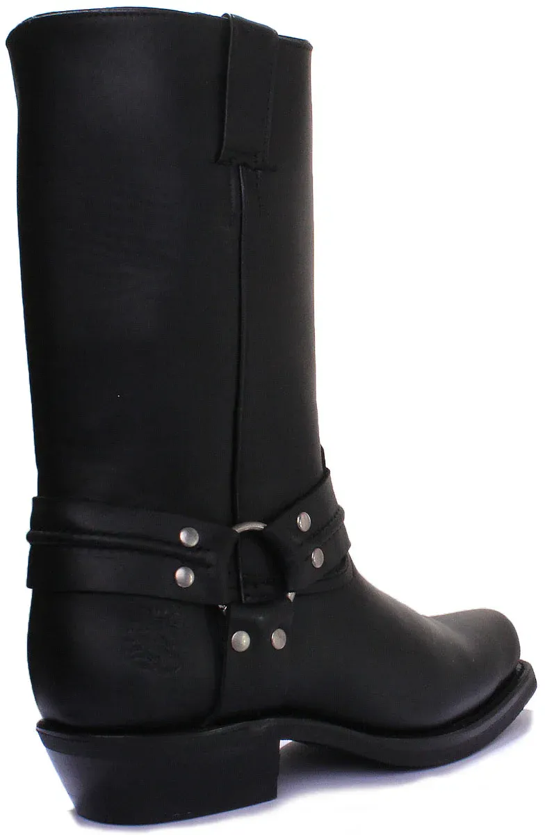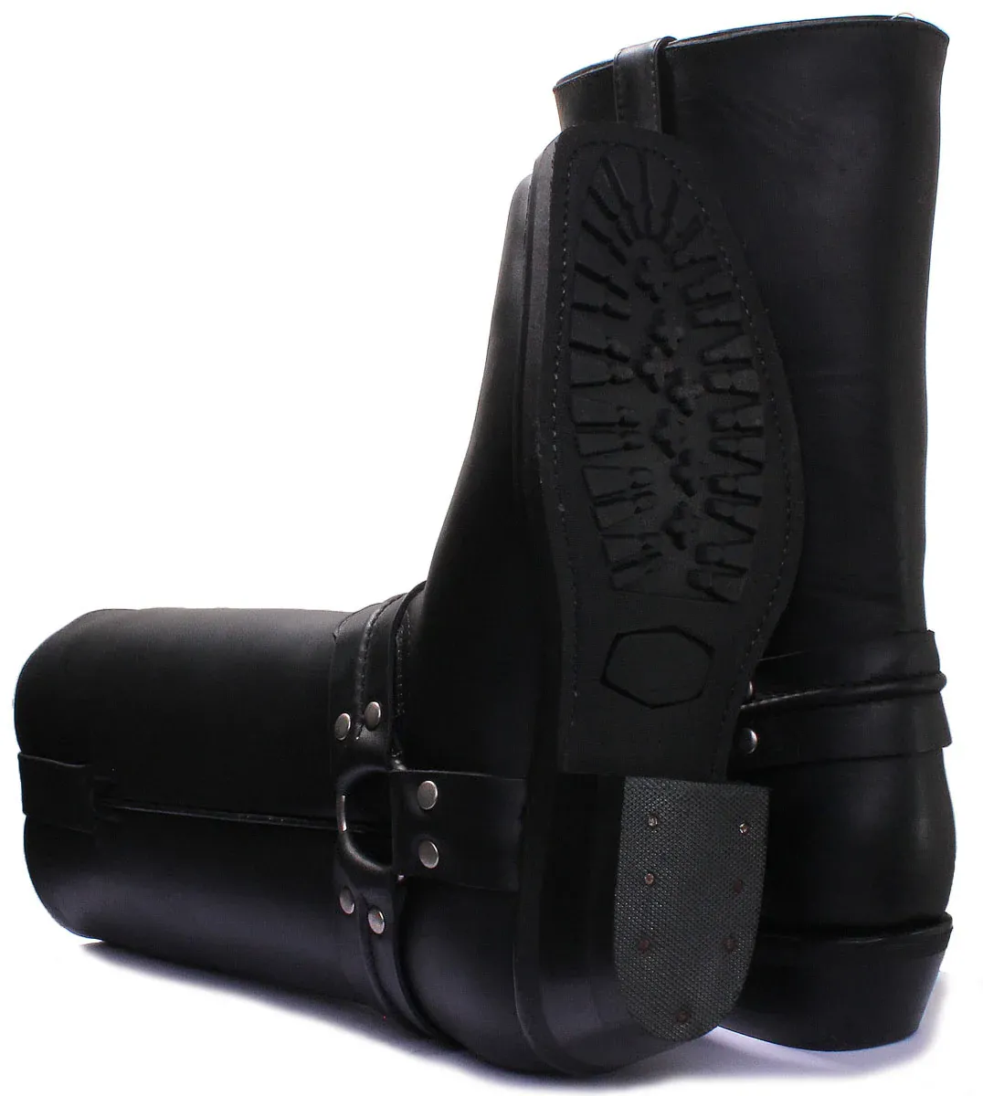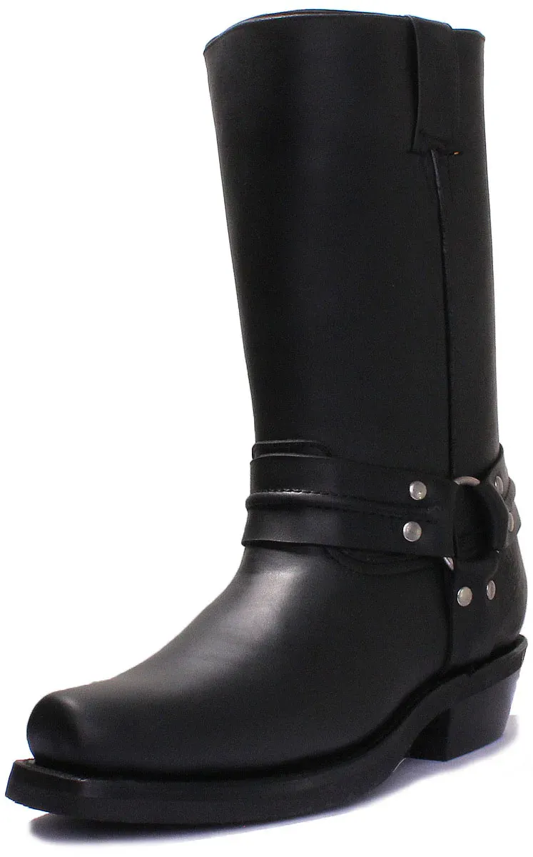 These boots feature a square toe silhouette and a distinctive harness detail that commands attention. Crafted from premium leather, they offer durability and comfort, making them a statement piece for any wardrobe.