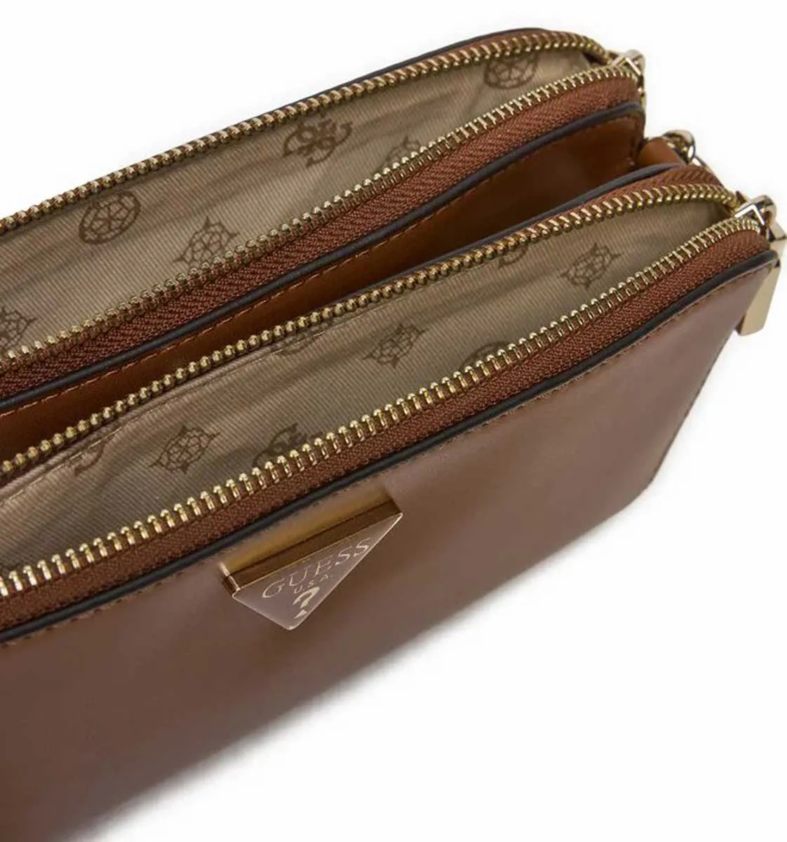 The bag features a structured design, ensuring it maintains its shape and offers ample space for essentials. The front showcases the iconic Guess logo in a triangular metal plate, adding a subtle yet recognisable brand detail that enhances its chic aesthetic. Double zip compartments provide organised storage, with meticulously crafted zippers ensuring easy access and secure closure for your belongings.