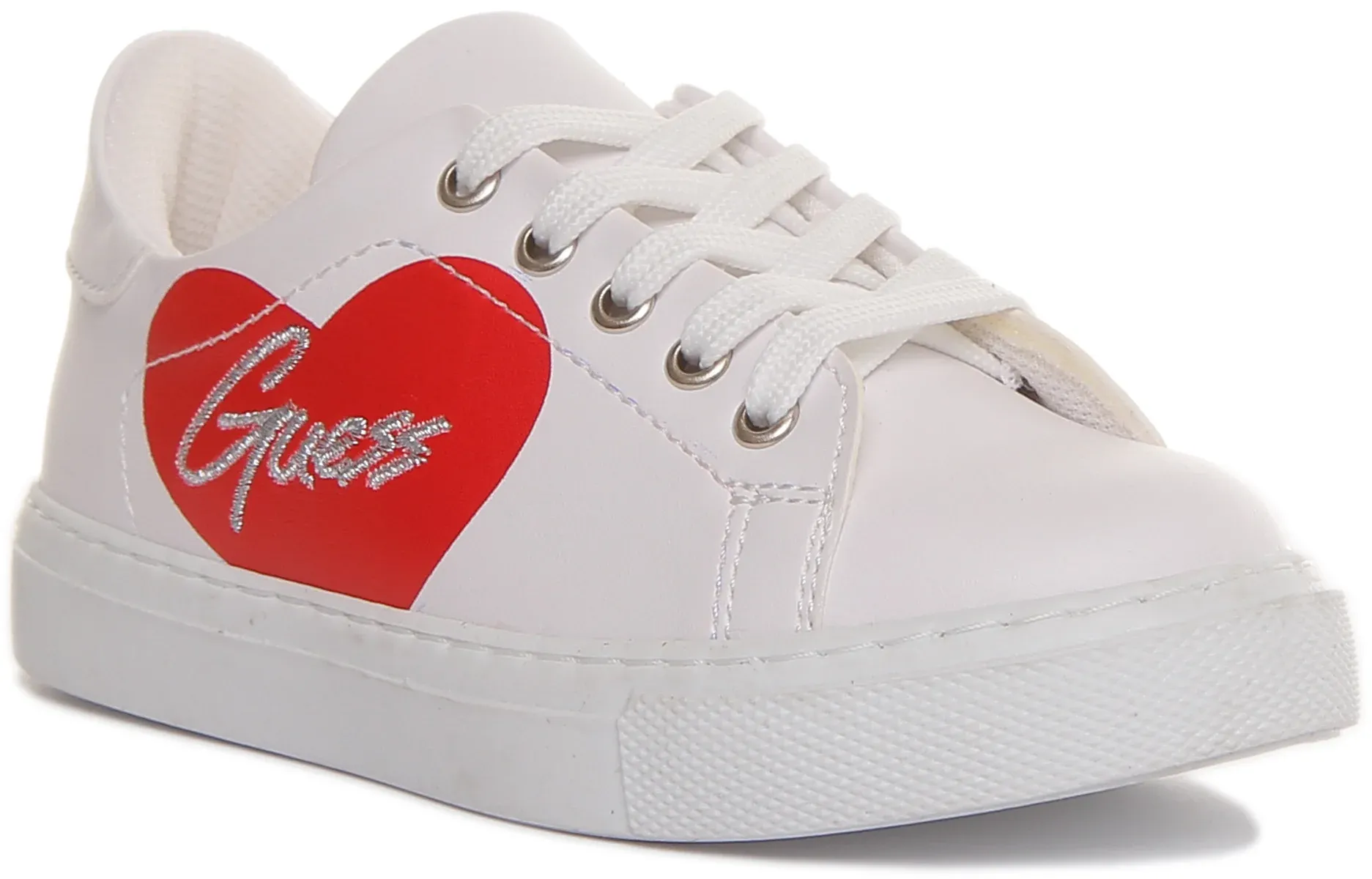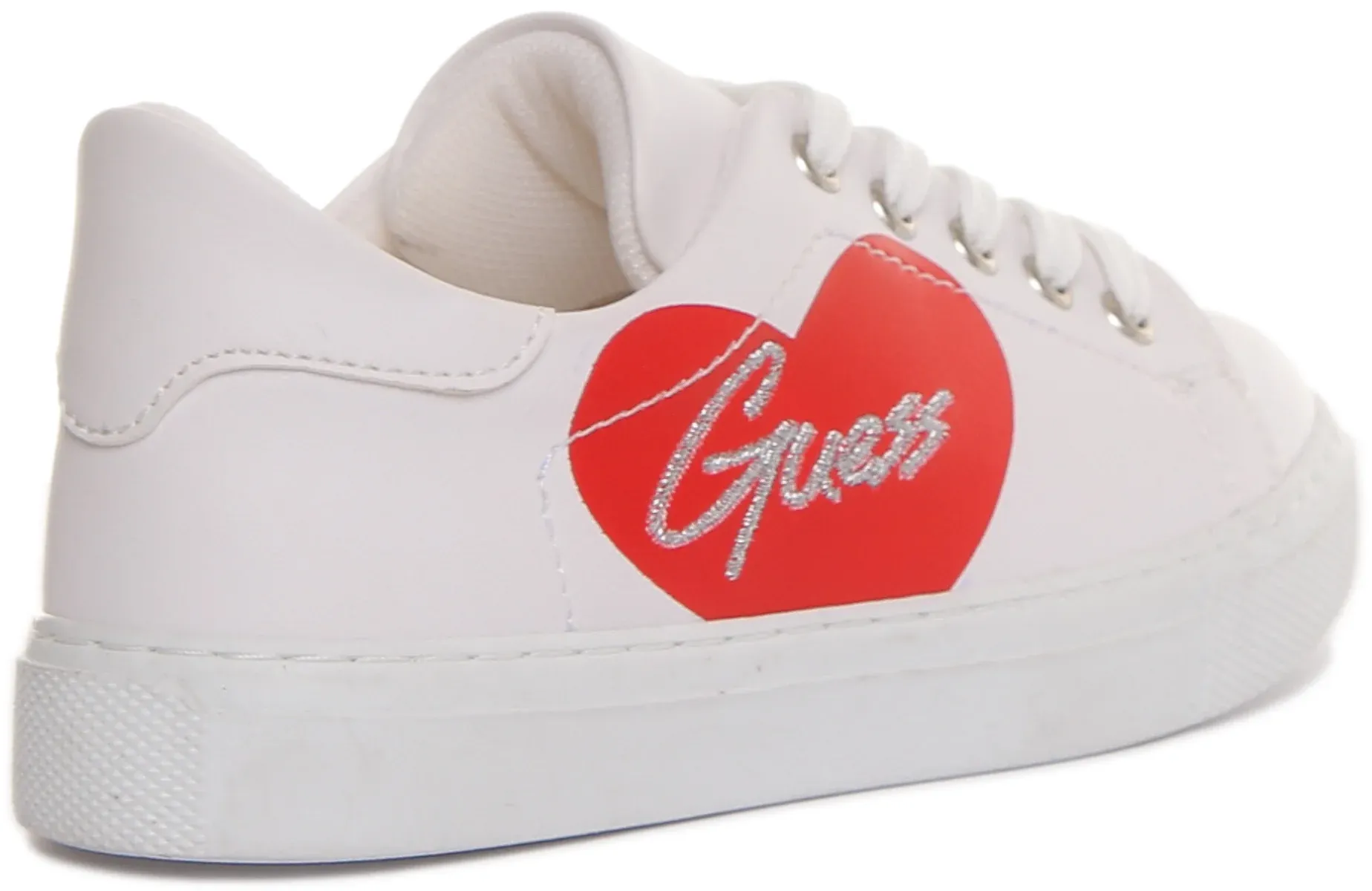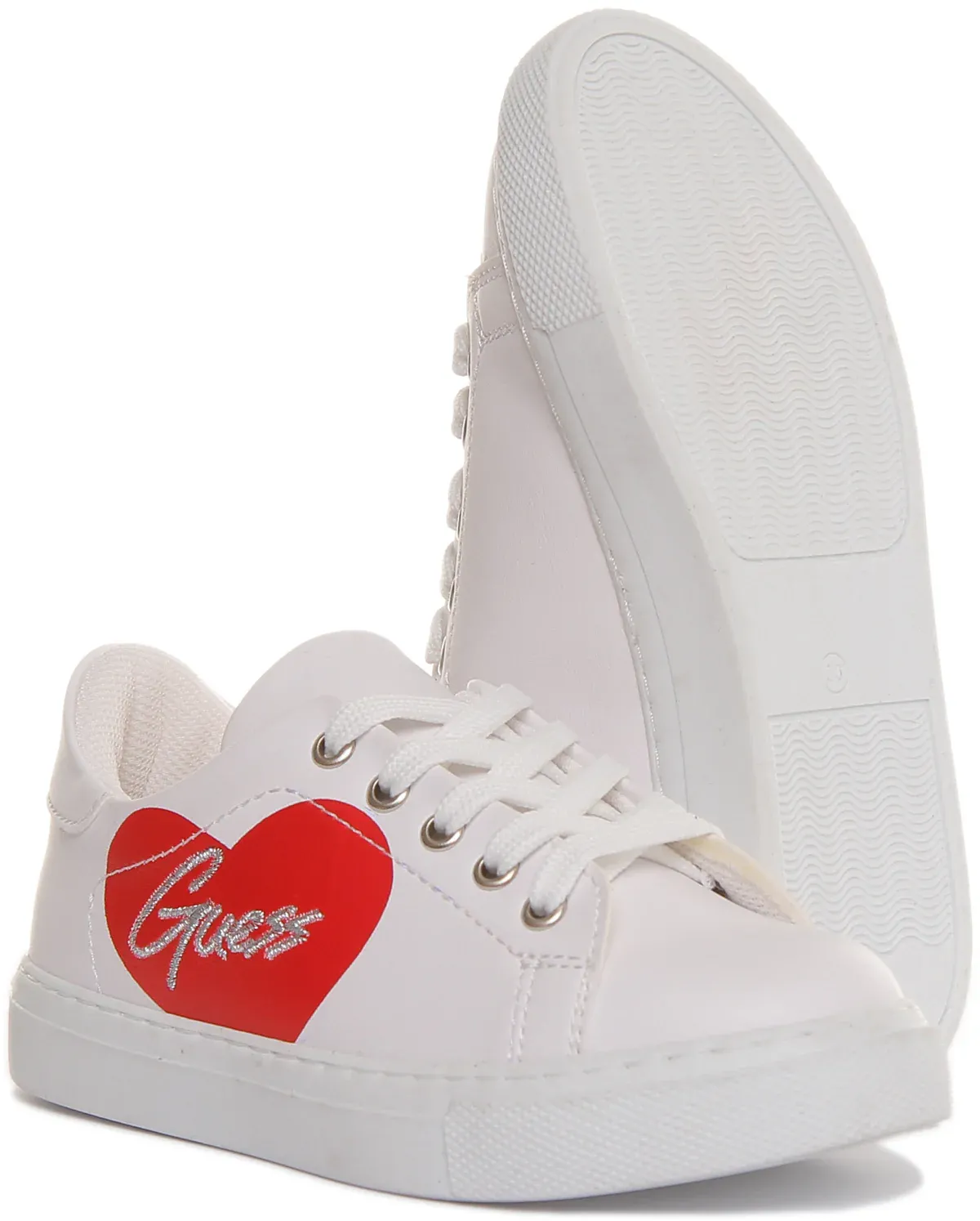 Step out in style with these casual Ellie sneakers from Guess. Made from premium synthetic material, these sneakers feature heart print at the side with embroidered Guess lettering. Mesh insole and lining provide added comfort to your feet all day long, while the lace up closure offers secure fit. Rubber outsole ensures excellent grip and stability. Perfect shoes for any casual occasion.
