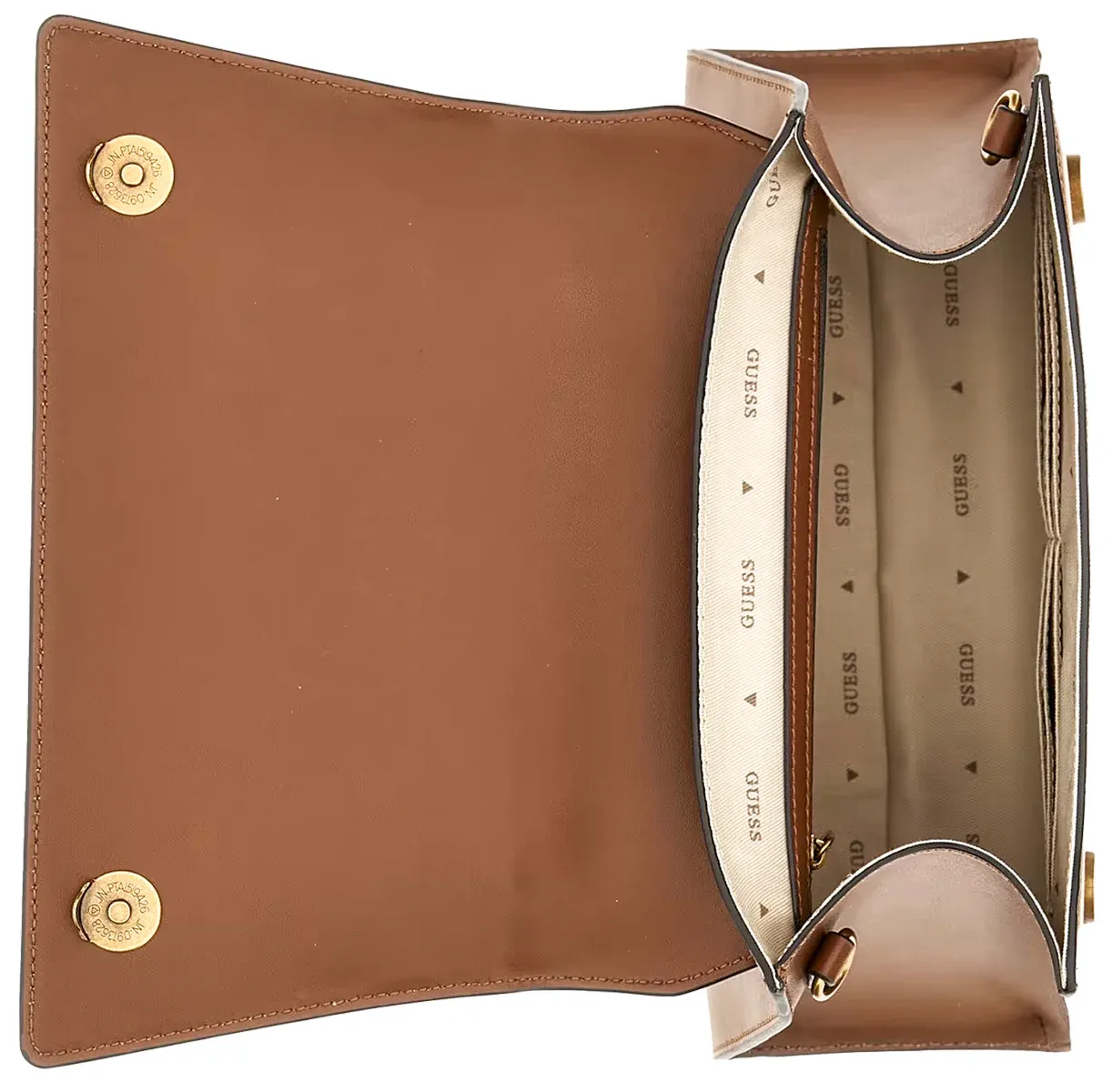 The Guess Stephi Bamboo Hardware Flaps Women’s Faux Leather Bag in Cognac is a timeless and sophisticated accessory that adds a touch of refinement to any look. Crafted from highquality faux leather, this bag boasts durability and a luxurious look without the use of animal products. The rich cognac colorway exudes warmth and elegance, while the bamboo hardware detailing adds a chic and stylish touch.