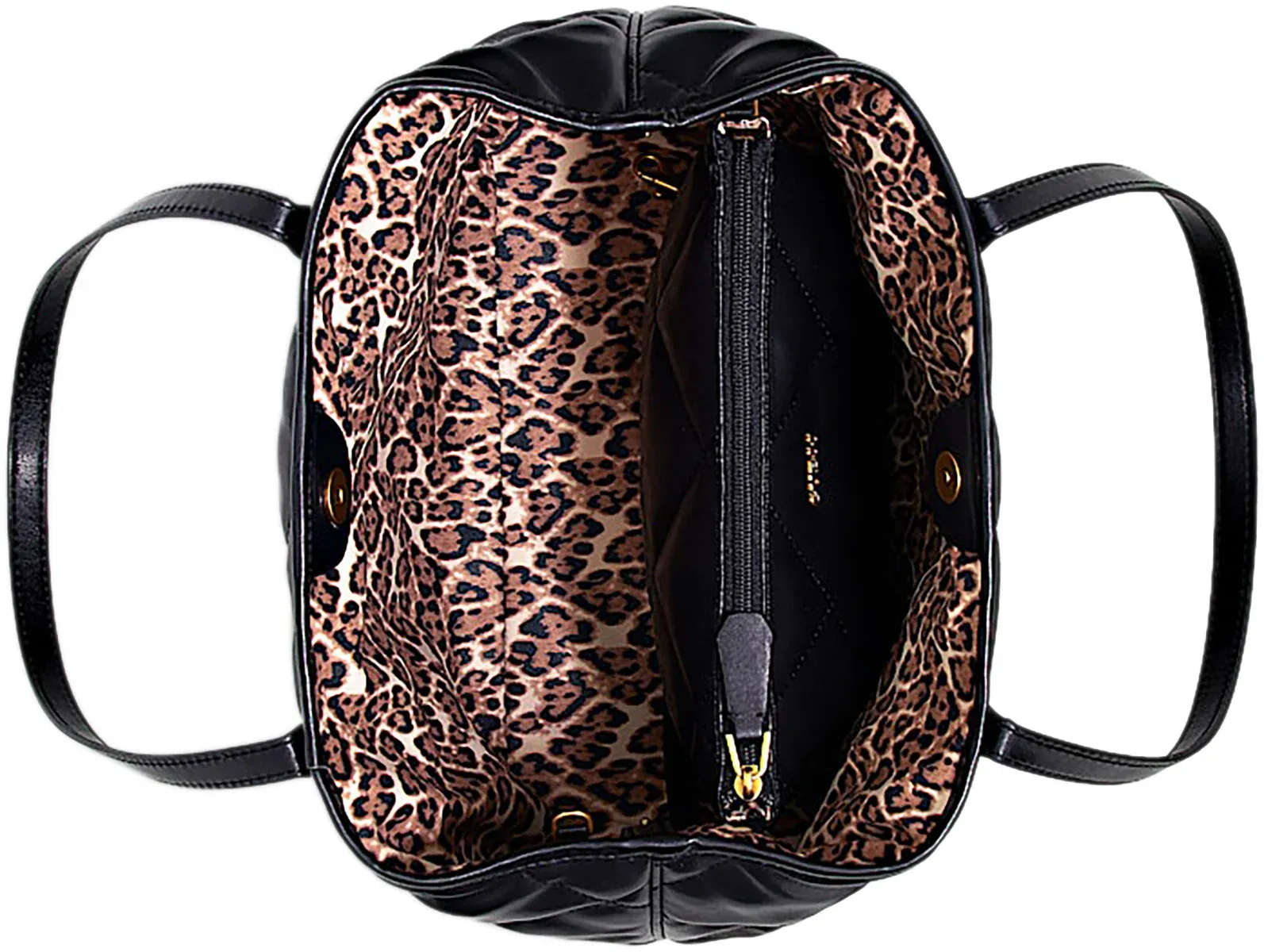 This bag’s spacious main compartment provides ample room for carrying all your essentials throughout the day, from wallets to keys, makeup, and more. It includes a matching zippered pouch for added convenience, allowing you to organise smaller items securely. The interior is adorned with a bold leopard print lining, injecting a touch of playful character and stylish contrast to the bag’s sleek exterior.