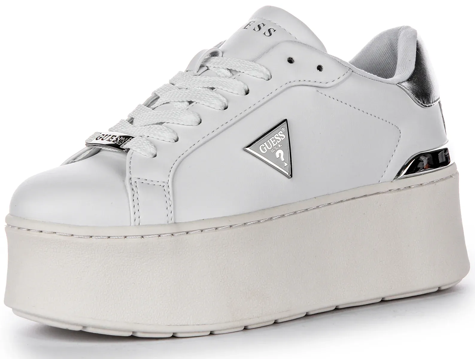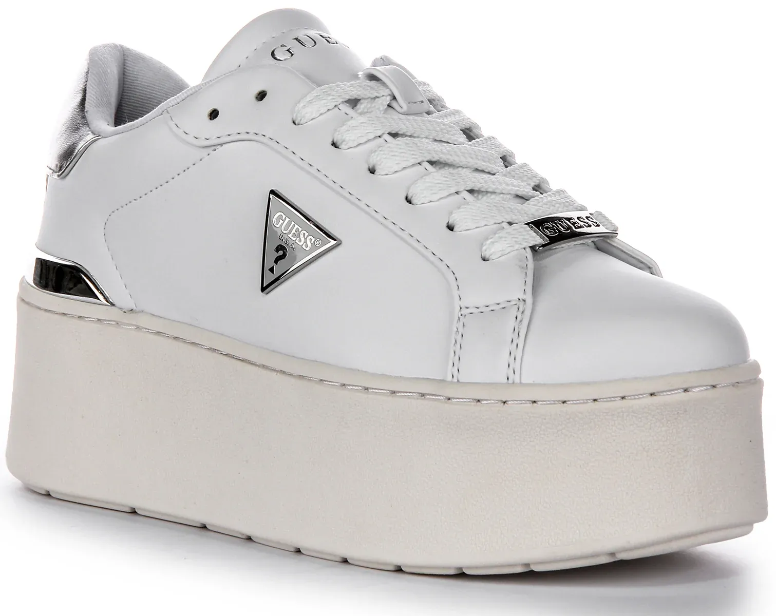 Crafted from high quality faux leather, these trainers feature a sleek and modern design with a platform sole that adds height and drama to any outfit. The clean white base is accented with metallic silver detailing, including the iconic Guess 4G Peony logo on the sides, for a touch of glamour. These trainers are designed with a lace up closure for a secure and adjustable fit, while the cushioned insole provides comfort for all day wear.