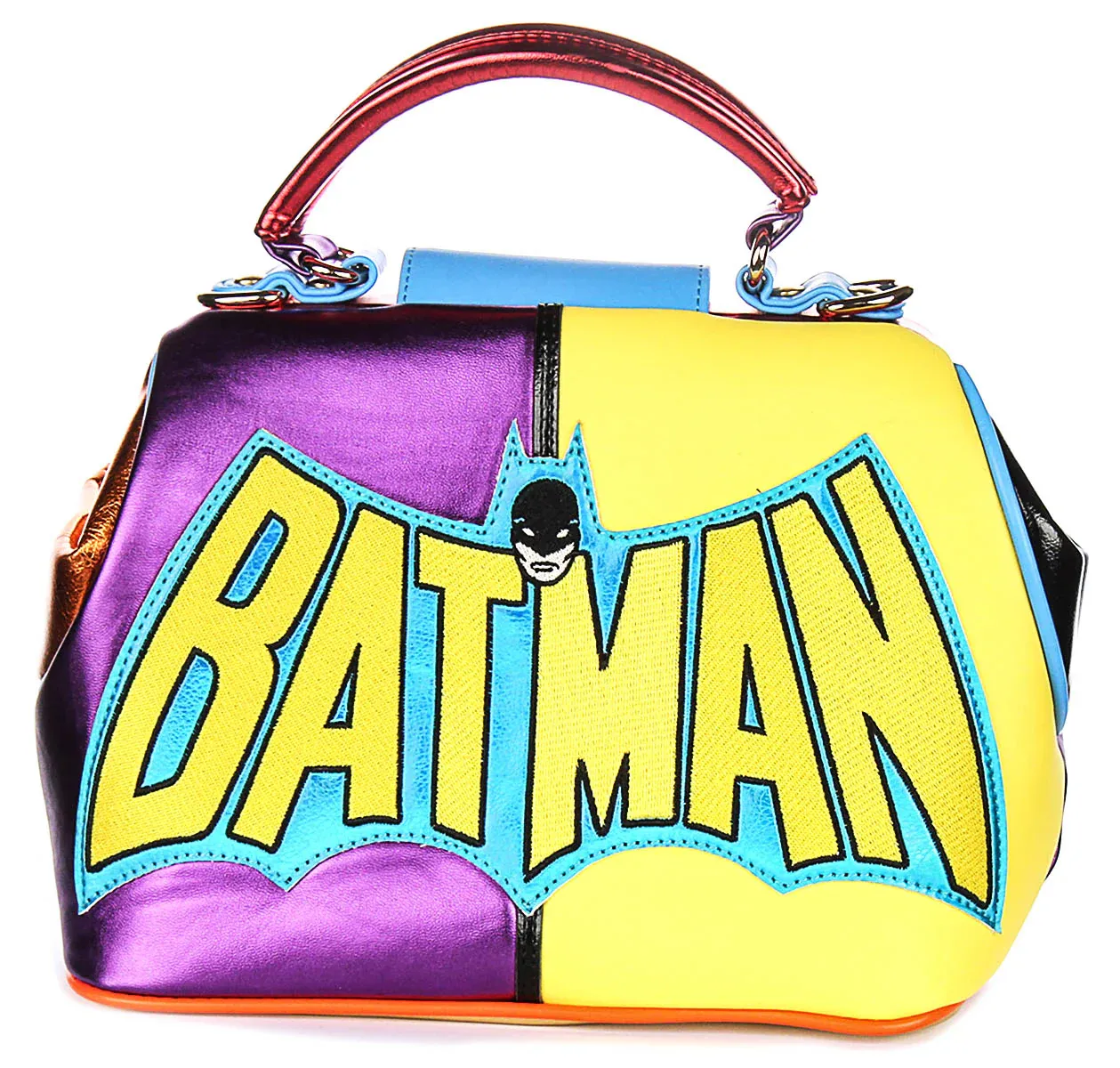 This doctor style handbag features everyone’s favourite mortal enemies, Batman and The Joker. It features a bold comic book graphic of the duo facing off in bright colors and the back is emblazoned with the classic old school graphic Batman logo. It has a top handle, adjustable shoulder strap and a magnetic oversized fold-over clasp. Perfect bag for Batman and The Joker fans.