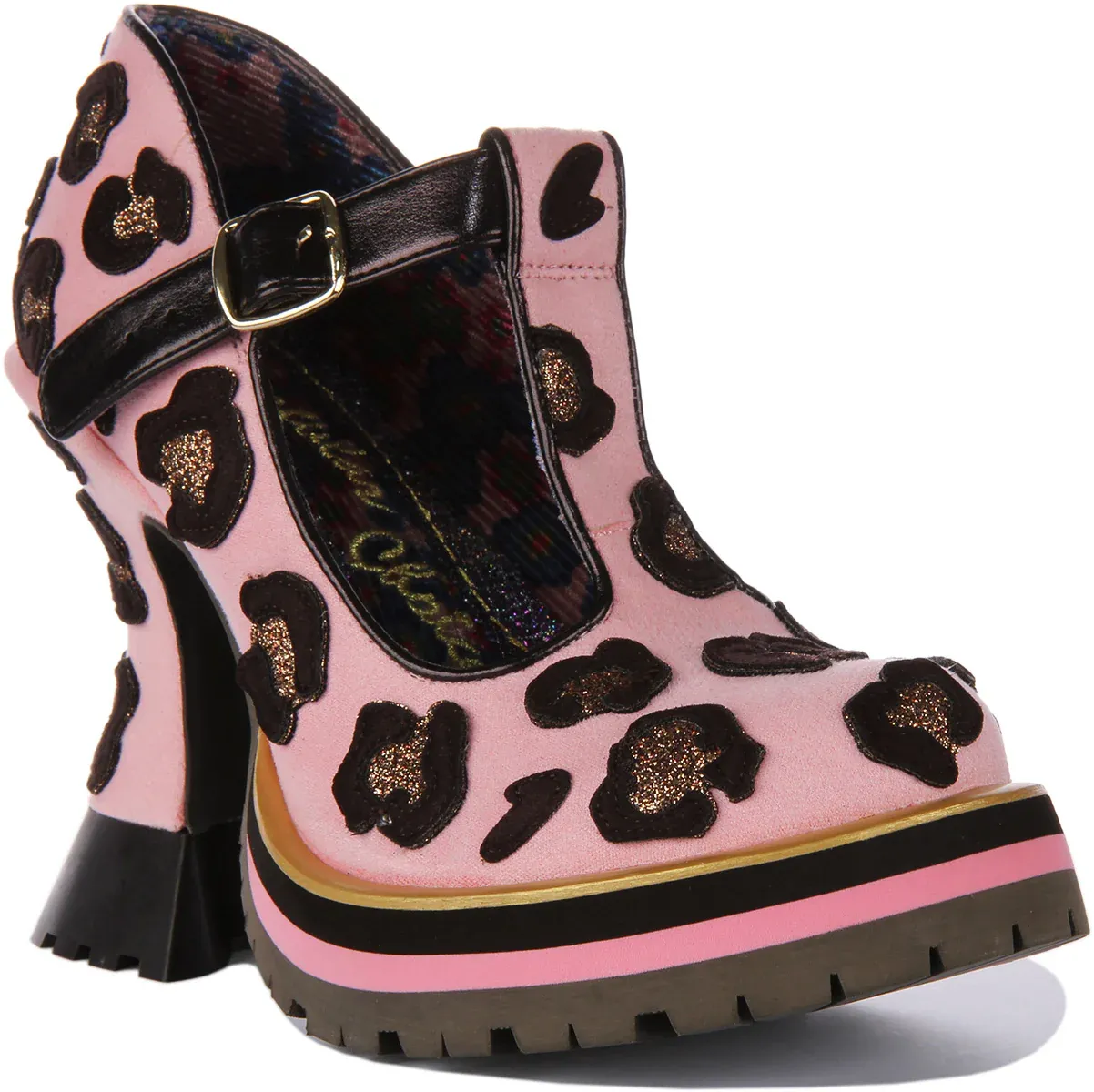 Covered in shimmering leopard spots, these 70s inspired platform heels are perfect for a party animal. Featuring Mary Jane style, these shoes have buckle fastening, cushioned insole and are fully lined. The decorative flared heels add a funky look to your style. Buckle up and party on down in these beauties from Irregular Choice.