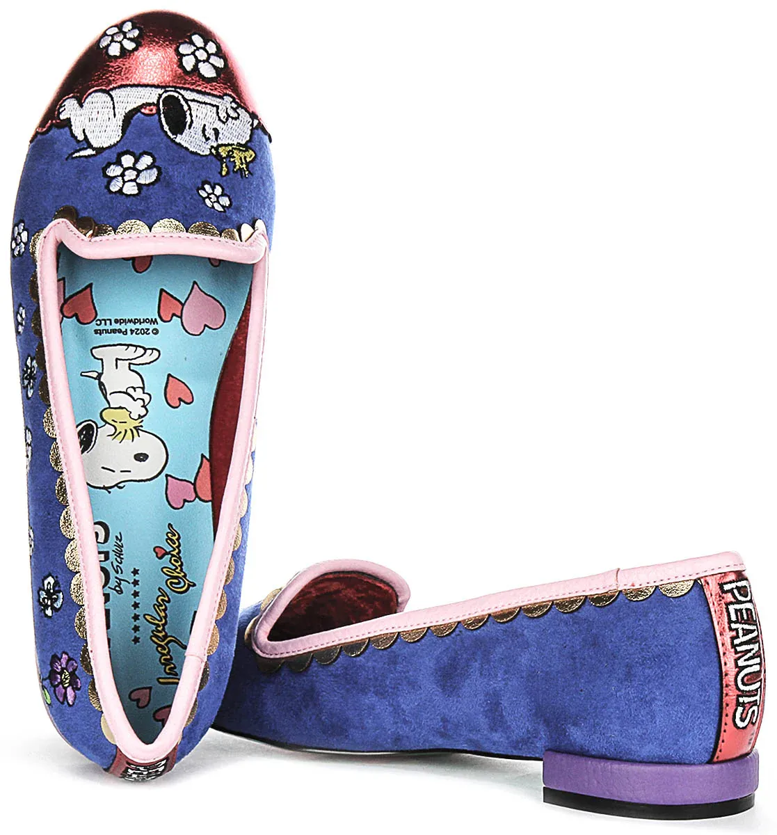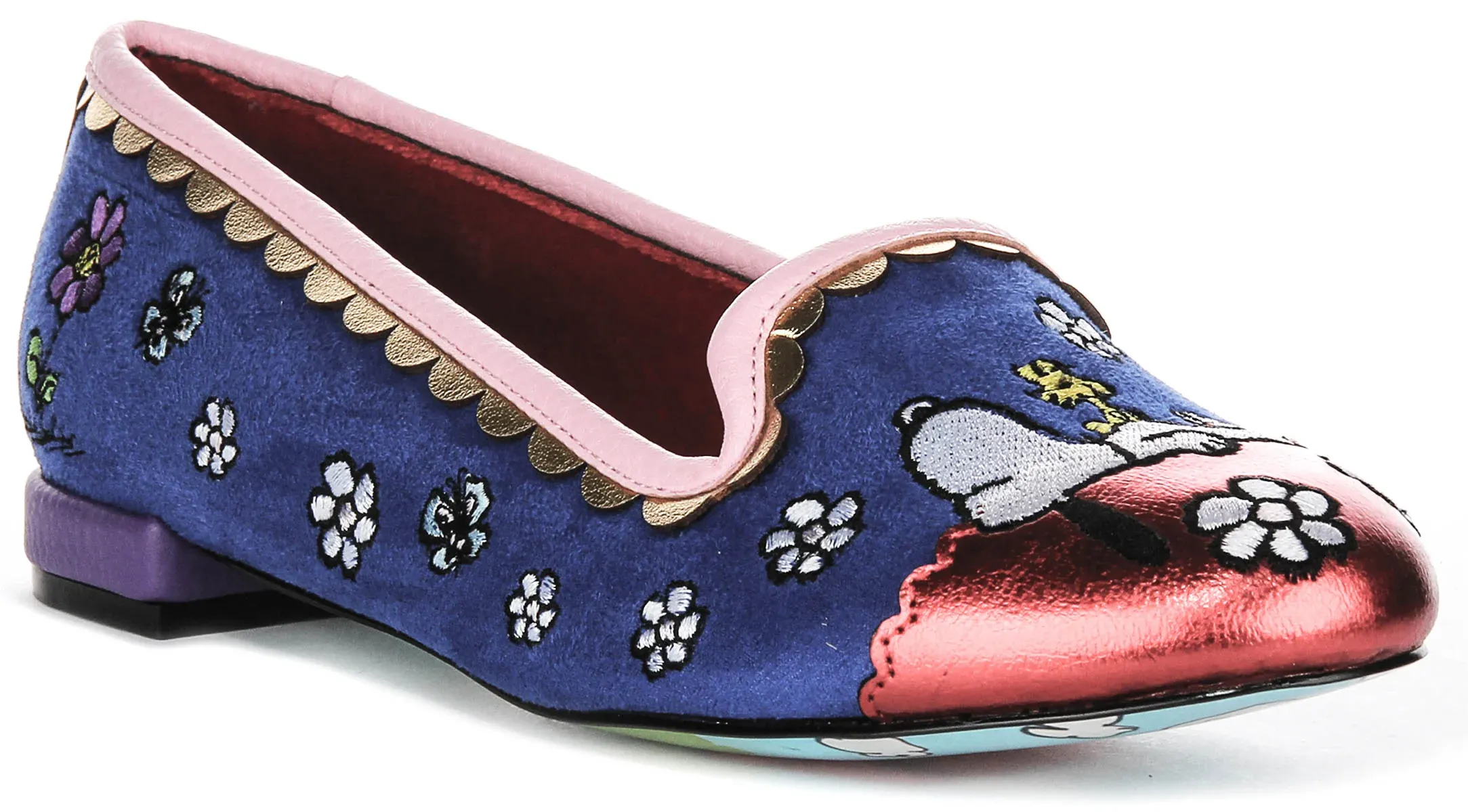 The vibrant design of the “My Friend Snoop” shoes is nothing short of enchanting. The outer fabric is adorned with charming floral embroidery, featuring delicate flowers scattered across a rich blue backdrop. This colourful motif brings a sense of fun and lightness, complemented by an eye-catching metallic pink toe cap that adds a touch of glamour. The scalloped edging in a soft pink hue enhances the overall quirky appeal, making these shoes a true statement piece.