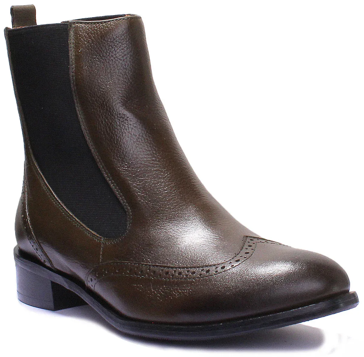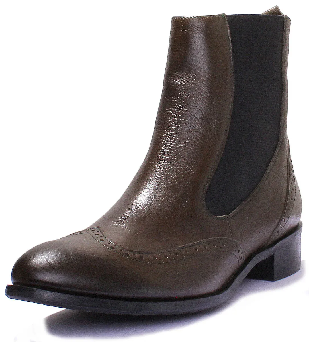 Crafted from premium leather upper, this high chelsea boot from Justin Reess features pointed toe design with beautiful punch details. It has slip on closure with elasticated sides and heel pull tab at the back for easy on and off. Leather lining and insole provides added comfort, while the comfortable synthetic outsole ensures excellent grip and stability in every step.