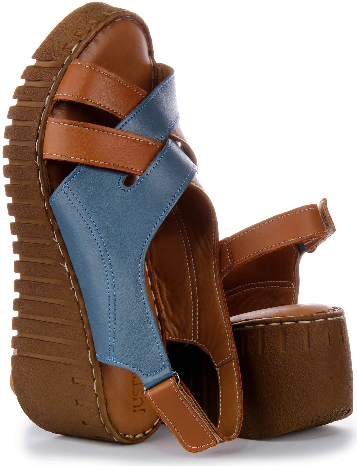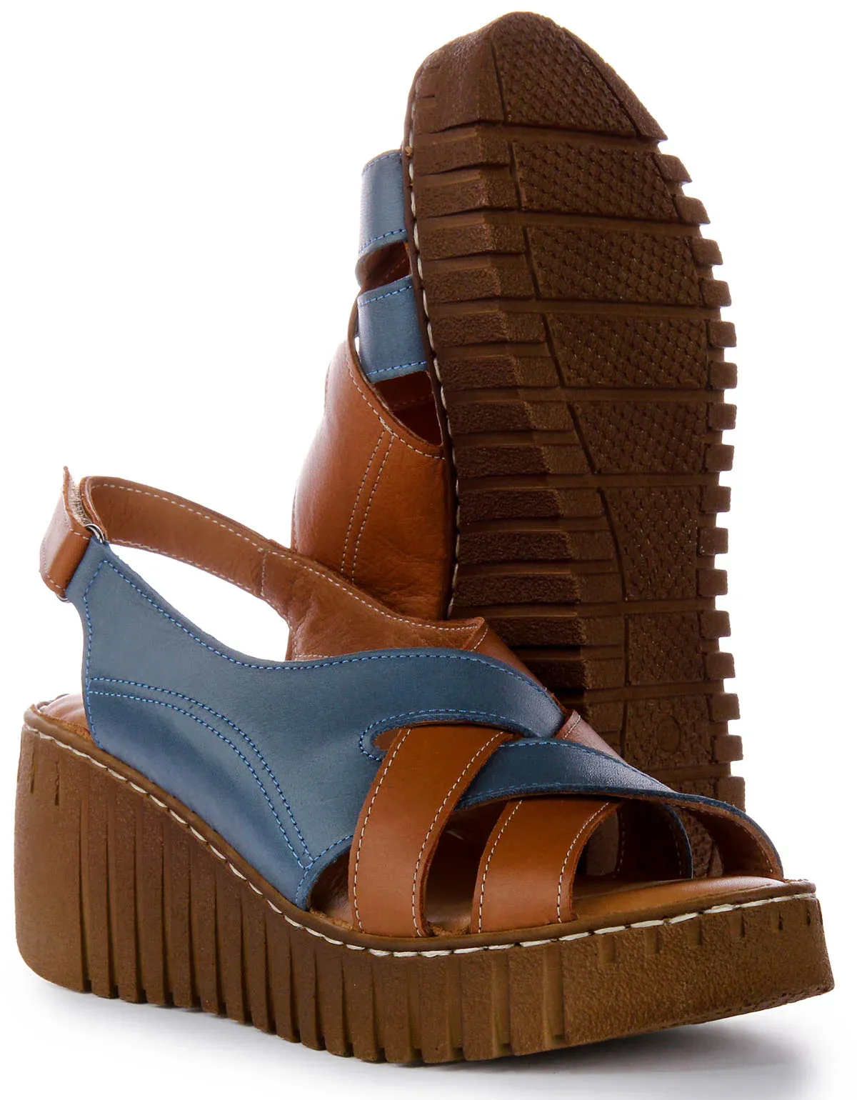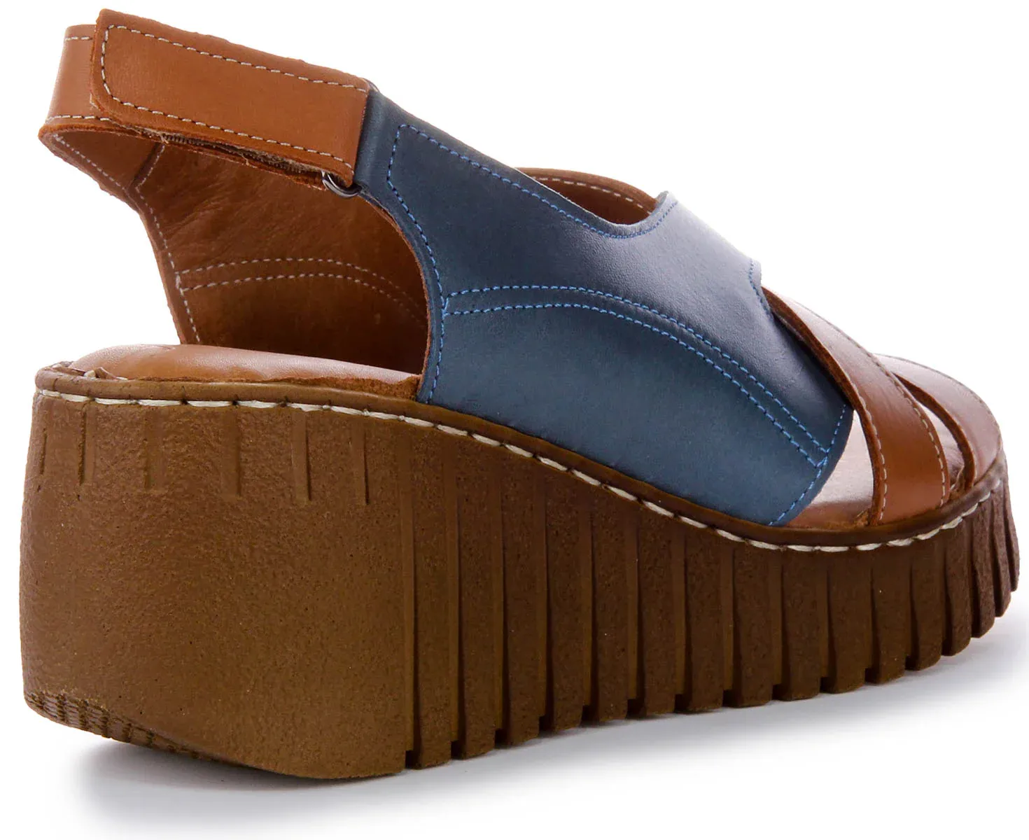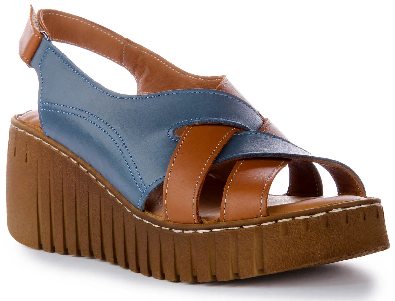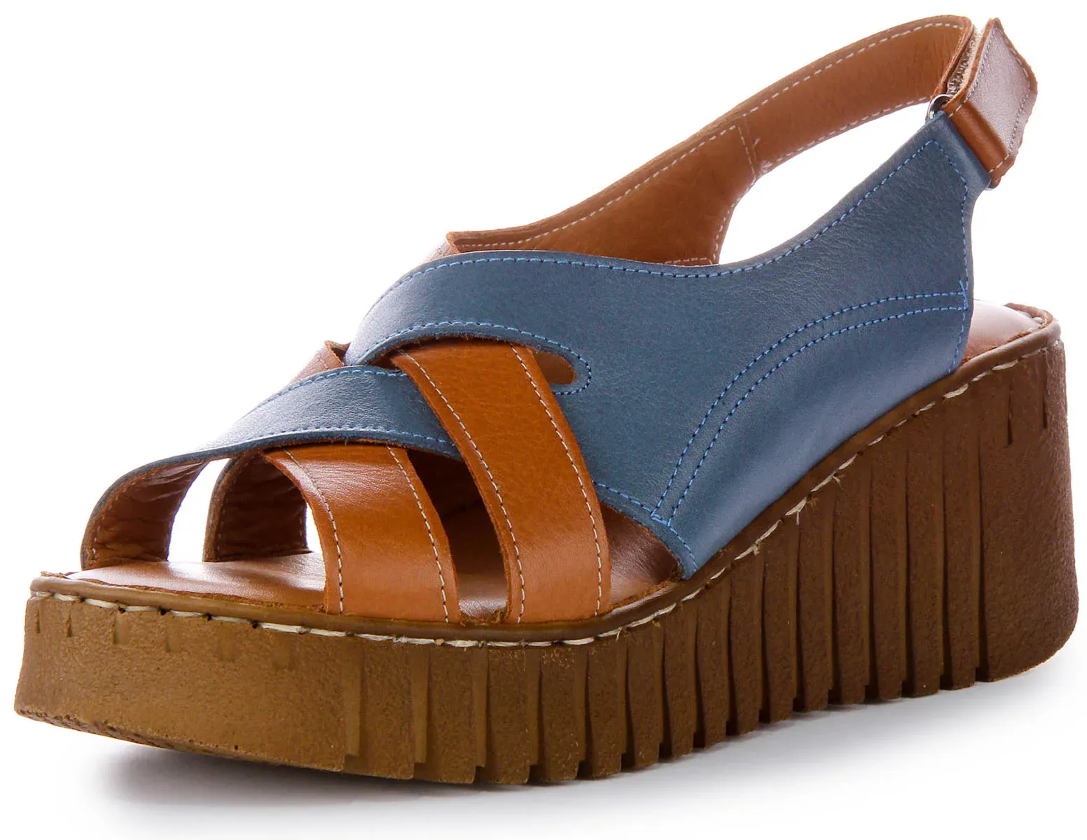 These leather wedges feature a low wedge and crossopen toe buckle design, offering a unique and stylish profile. The combination of brown and blue hues adds a touch of refinement, making these wedges a versatile choice for various occasions.