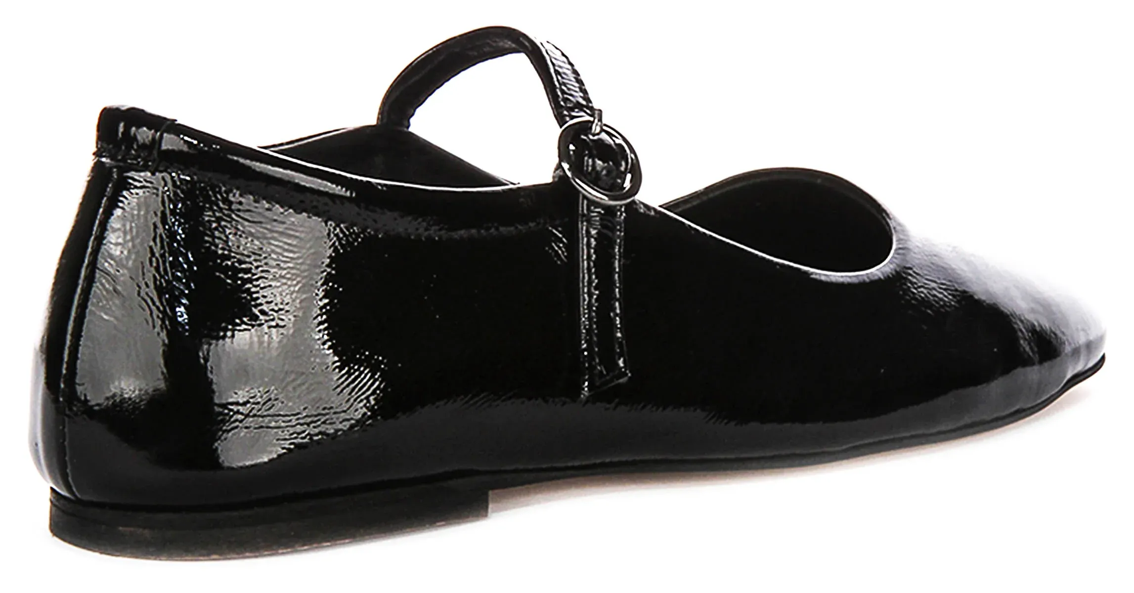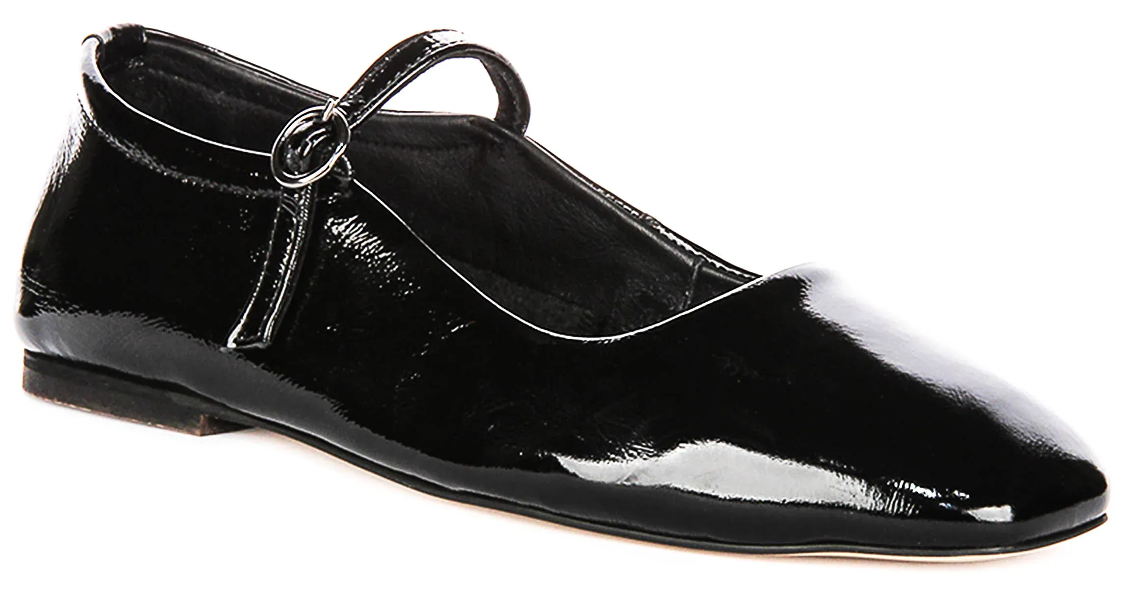 The Justinreess England Women’s Leather Flat, known as the Kiera, is an elegant and versatile shoe designed for a modern and sophisticated look. Crafted from high-quality leather, the shiny black finish adds a touch of luxury and refinement, making it suitable for both casual and formal occasions.