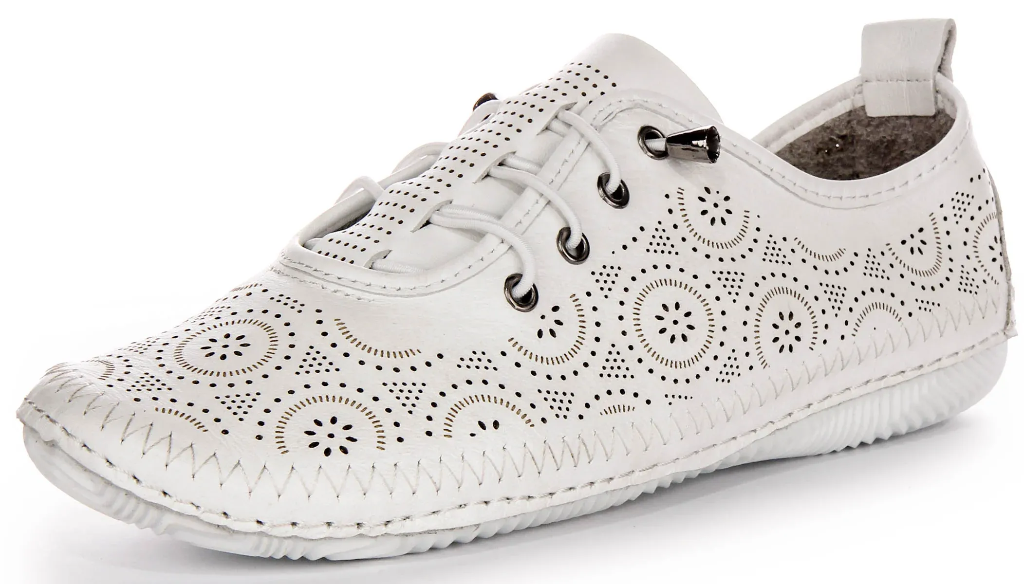 These stylish leather shoes feature a unique perforated geometric pattern that exudes contemporary charm. Crafted from soft leather, they offer comfort and style in equal measure. The low heel and cushioned insole ensure all day wearability, making them ideal for both casual and dressy occasions.