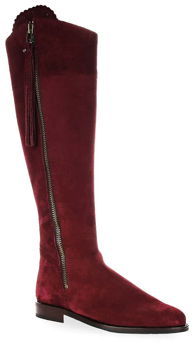 These boots feature a sleek side zipper that runs nearly the full length of the boot, providing not only ease of access but also adding a stylish detail. The zipper is accented with a tassel, enhancing the overall design with a subtle touch of flair. The deep, rich colour complements the suede texture beautifully, making these boots a standout addition to any outfit.