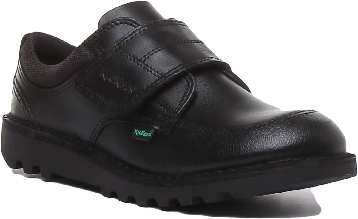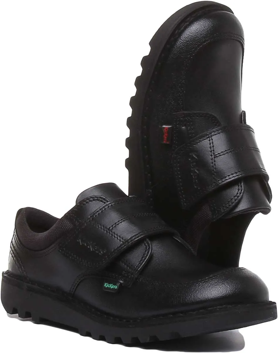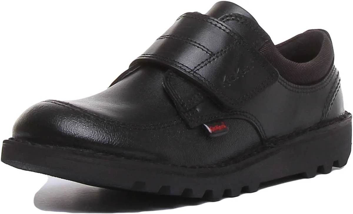 These sturdy shoes feature scuff resistant leather around the toes and heels to help them look good for longer. These shoes are perfect for active kids and have a durable chunky rubber outsole. It features easy on/off hook and loop closure strap. The padded collar and tongue makes them super comfy and keeps feet supported all day long. It has classic triple stitch detailing and iconic Kickers red and green tabs.