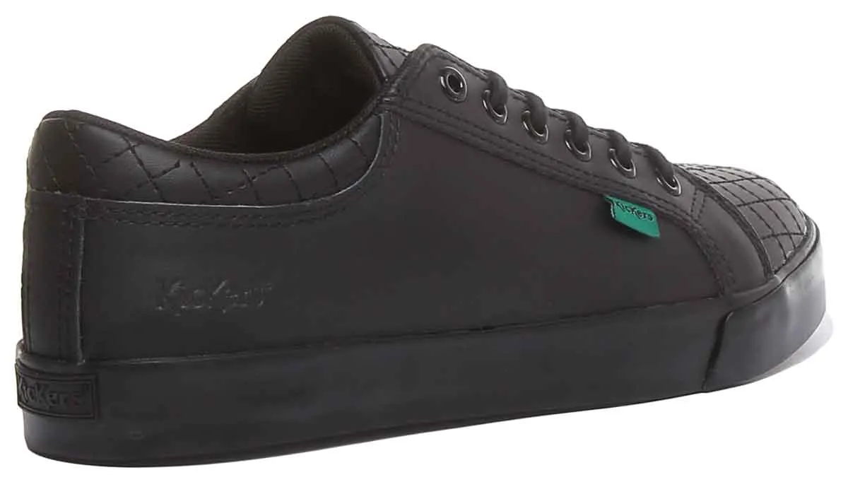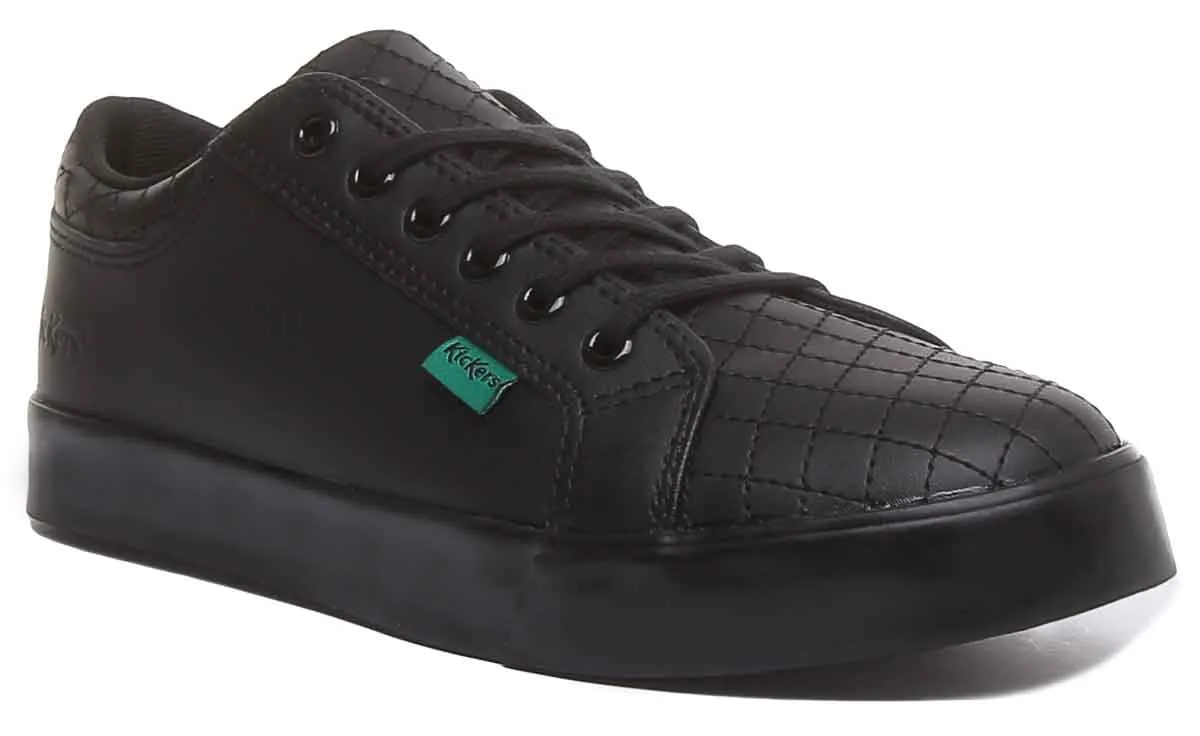 These are sneaker inspired shoes in matt black leather. Built on classic chunky sole, it has decorative quilting at the toe and around the ankle to keep young feet both comfortable and stylish. Remaining true to its roots, this style has signature triple stitching, comfy padded collar and branded detailing for an unmistakable Kickers style. It is completed with iconic red and green Kickers tabs at the sides.