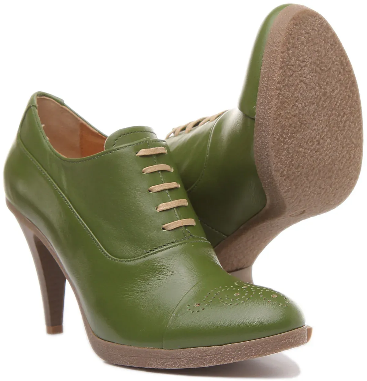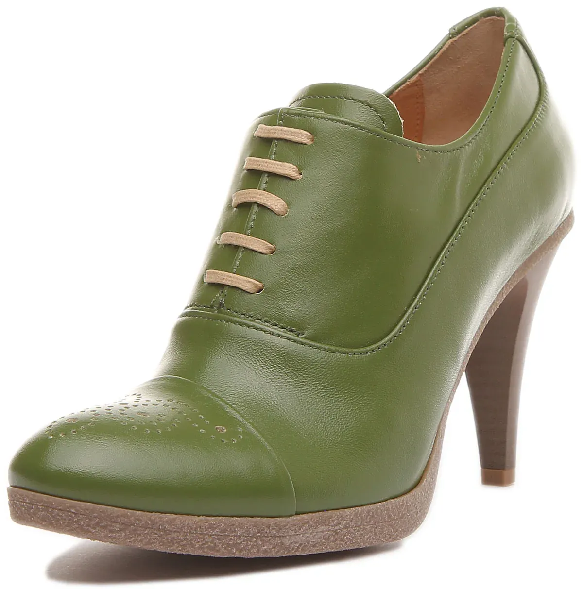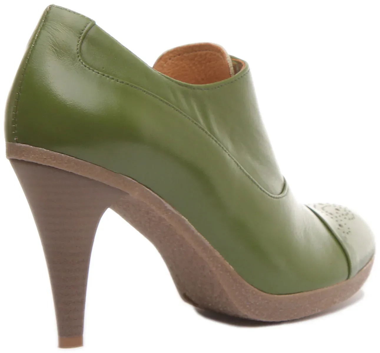Justin Reess has designed Margy, exotic heeled brogue shoes for women with premium leather upper. It has a soft leather lining and lace up closure. The wooden effect high heel adds elegance to the whole shoe, while the slip-resistance outsole ensures excellent grip and traction. Smooth sleek finish adds outstanding look giving it a perfect look for smart wear.