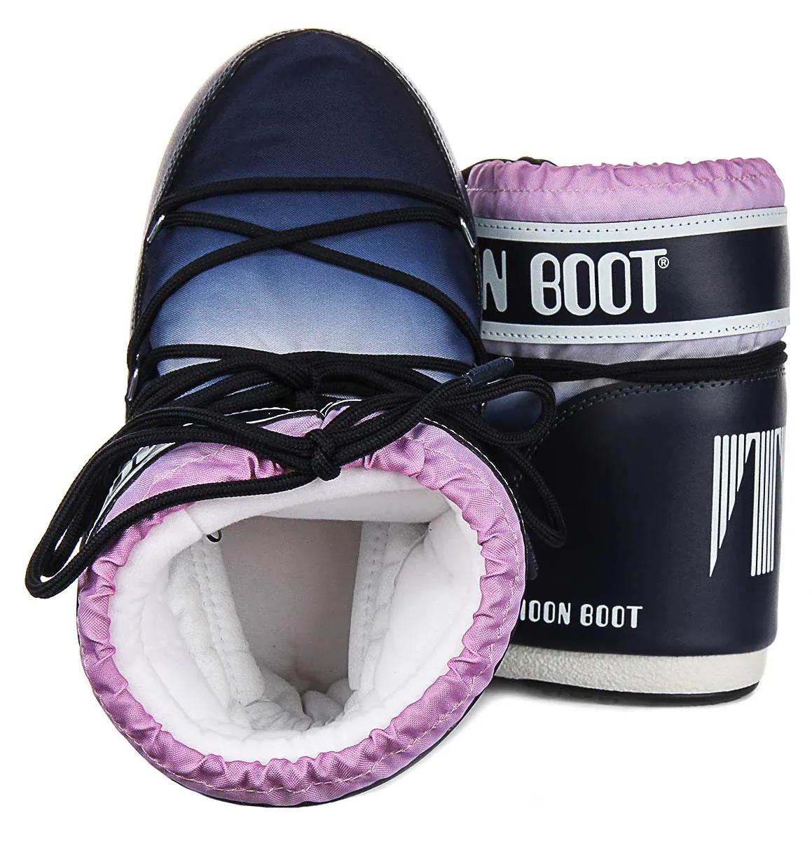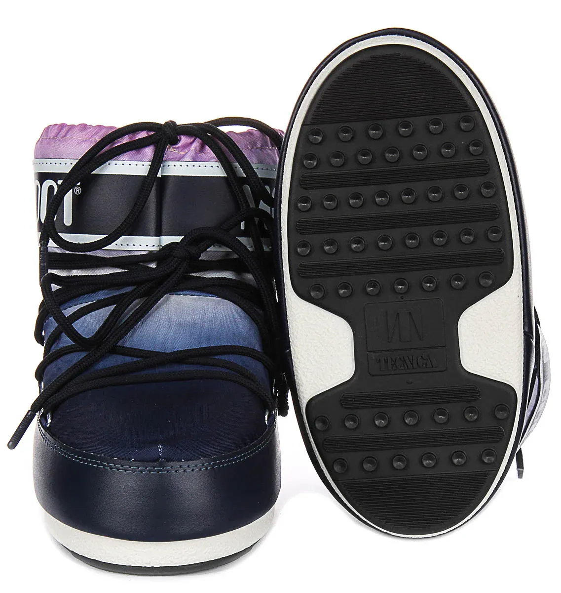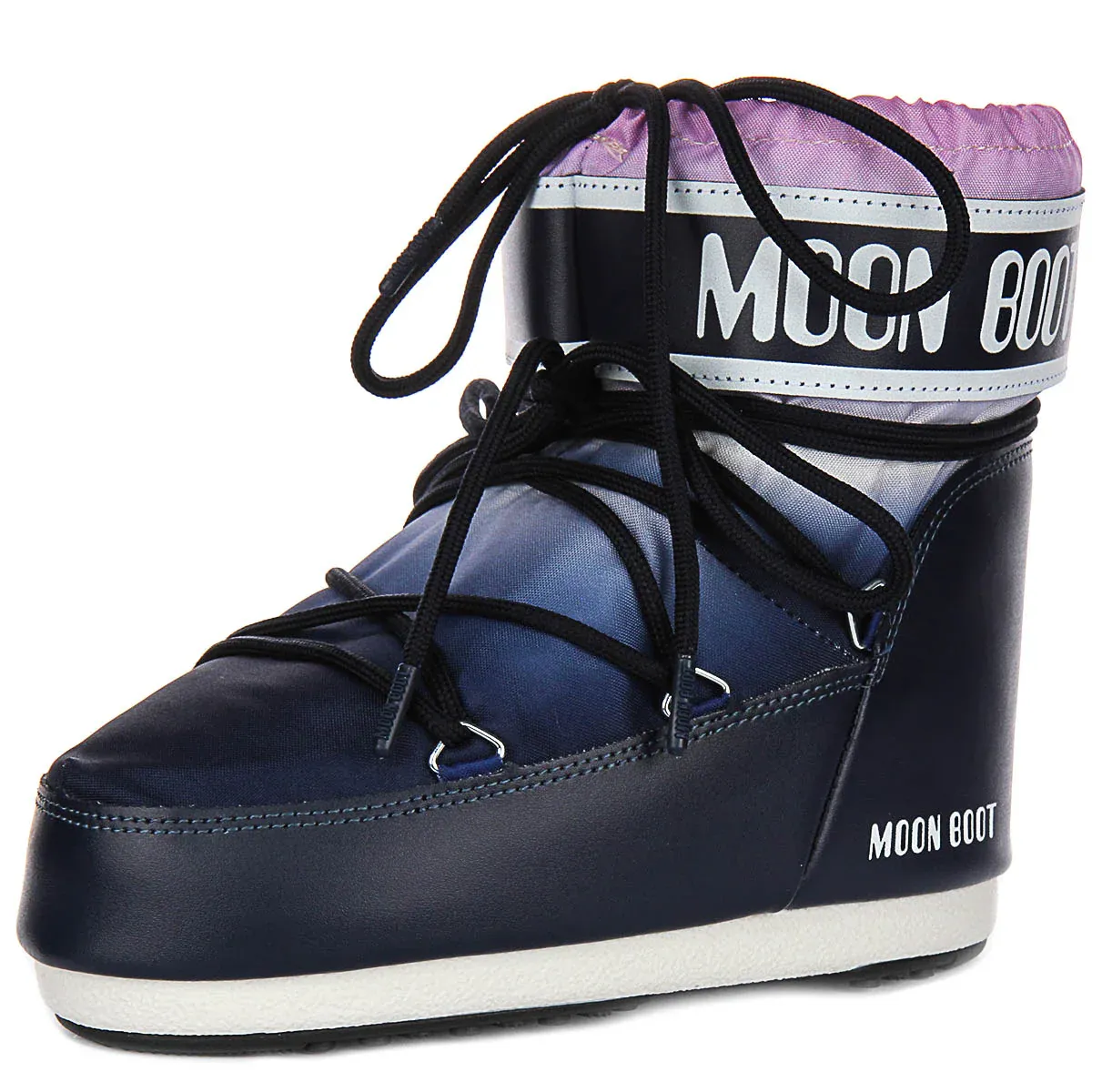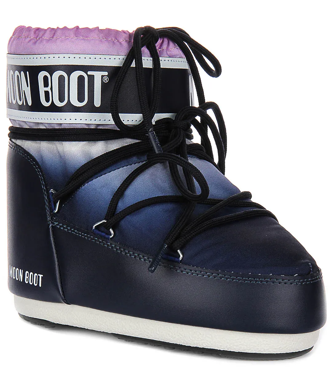 The boots exhibit a modern, gradient colourway with hues of navy, purple, and white, creating a space-inspired, dynamic look. They are finished with bold branding on the upper collar and heel, adding to their trendy, urban appeal. The black, crisscross laces not only add visual interest but also ensure a secure and adjustable fit.