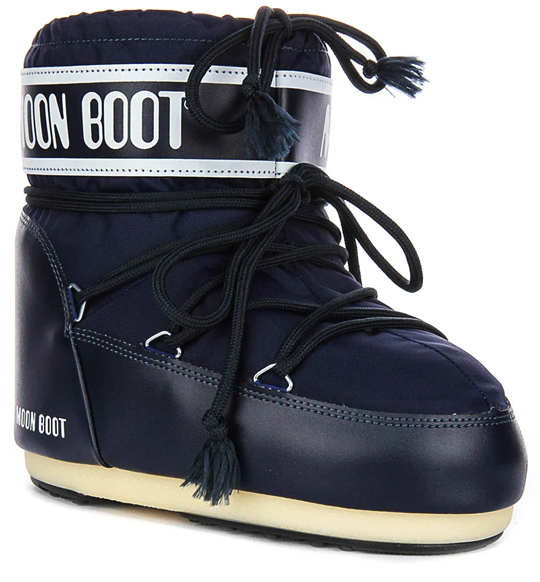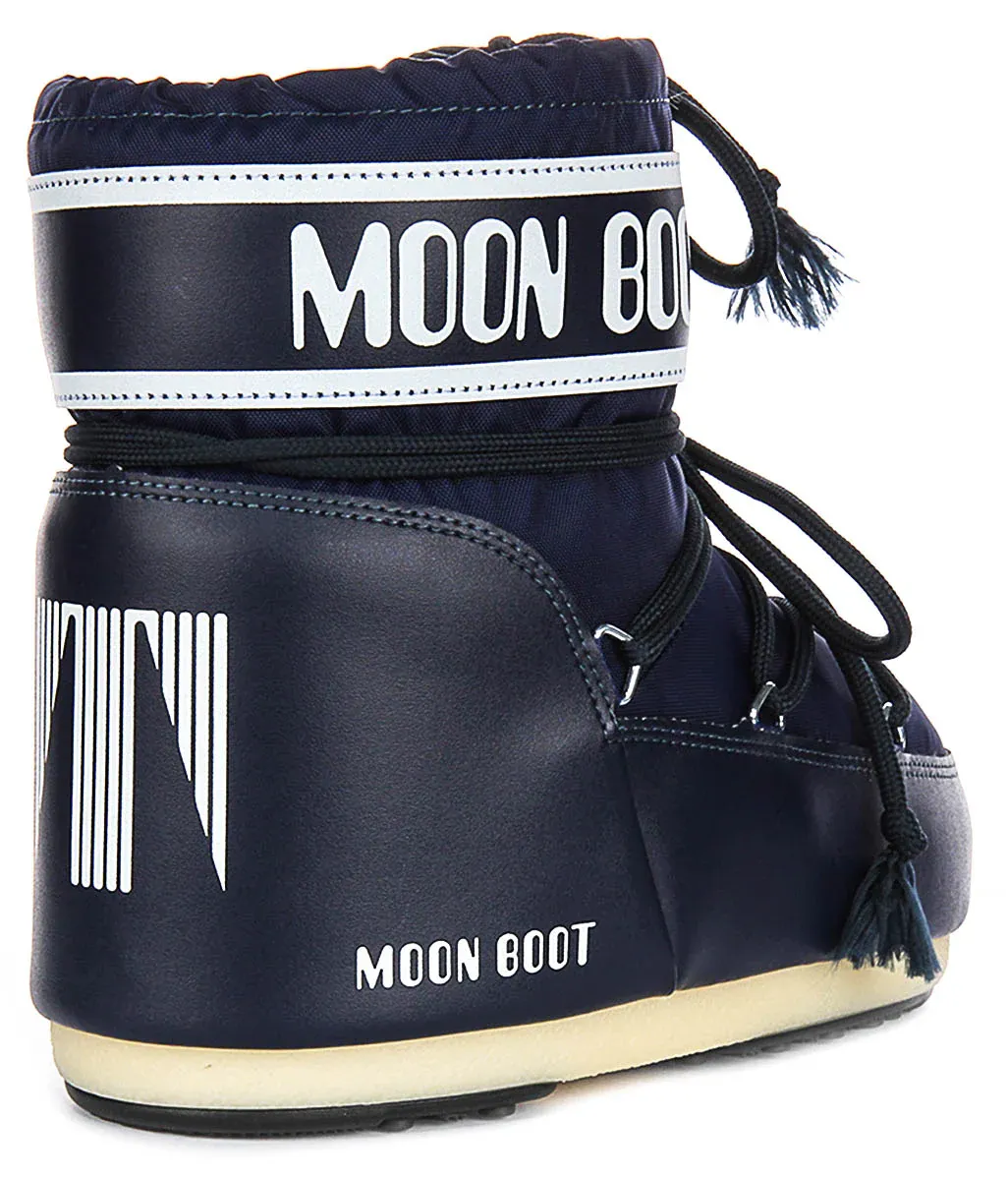The Moon Boot Women’s Icon Low Nylon Ankle Boots are a stylish and functional choice for enthusiasts of contemporary footwear. Designed with the iconic Moon Boot aesthetic, these boots are crafted from durable nylon, offering both resilience and a modern look. The navy blue hue is complemented by the contrasting logo, giving them a distinctive appearance that is both trendy and timeless.