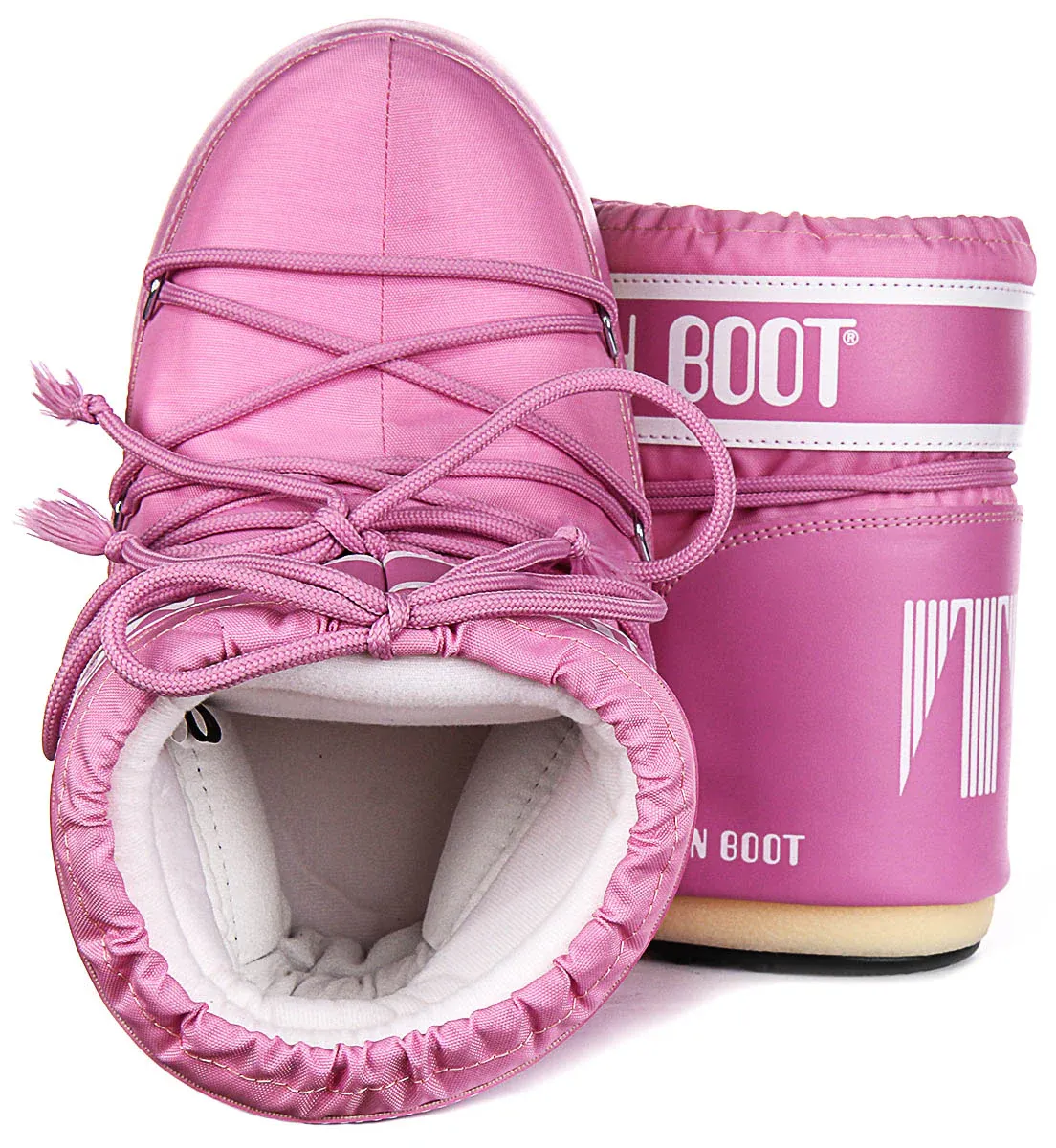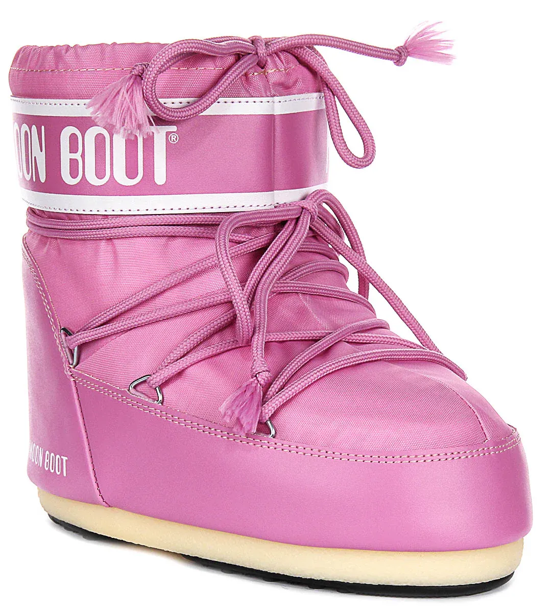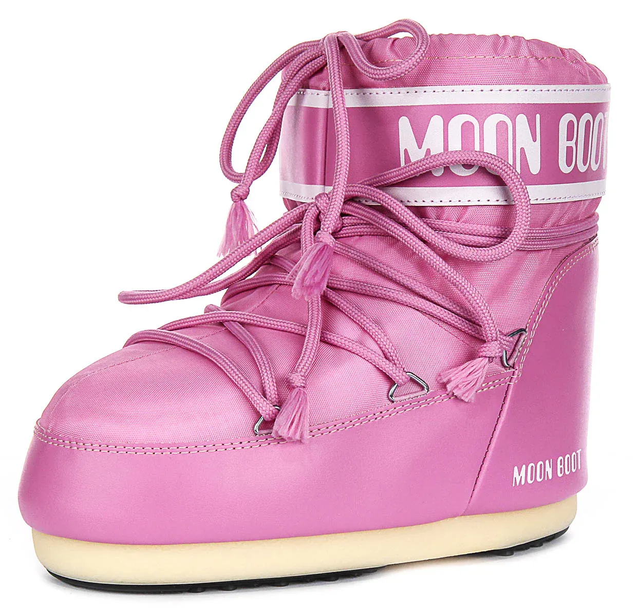 These boots feature a distinctive and iconic design, with the Moon Boot branding prominently displayed around the ankle. The lacing system not only enhances the visual appeal but also ensures a snug and adjustable fit, providing both comfort and support for your feet. The laces are adorned with small tassels, adding an extra touch of playful detail.