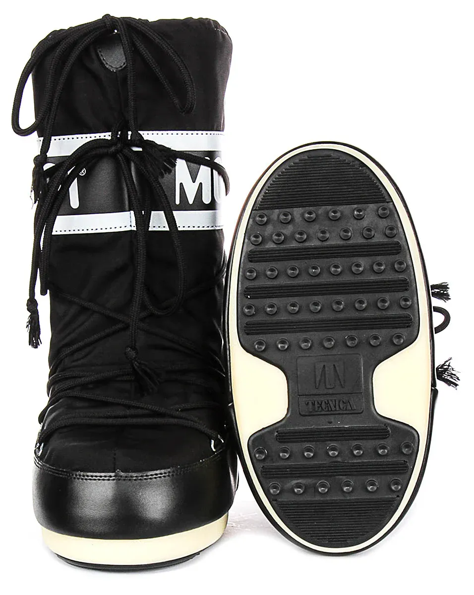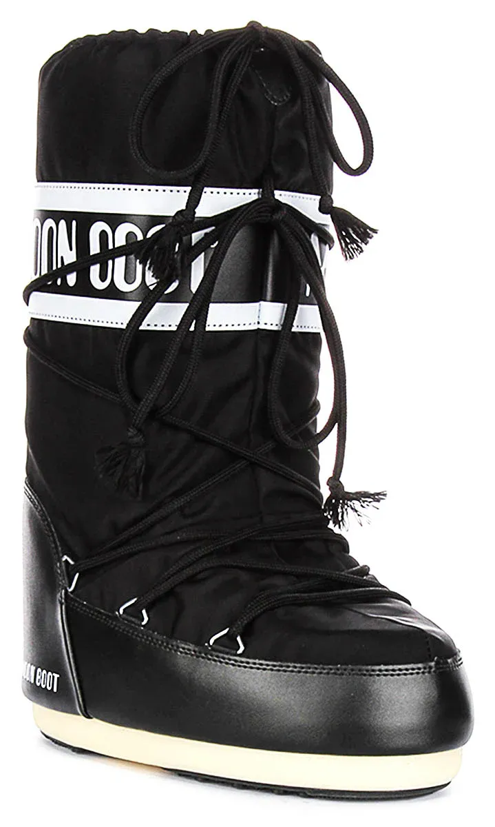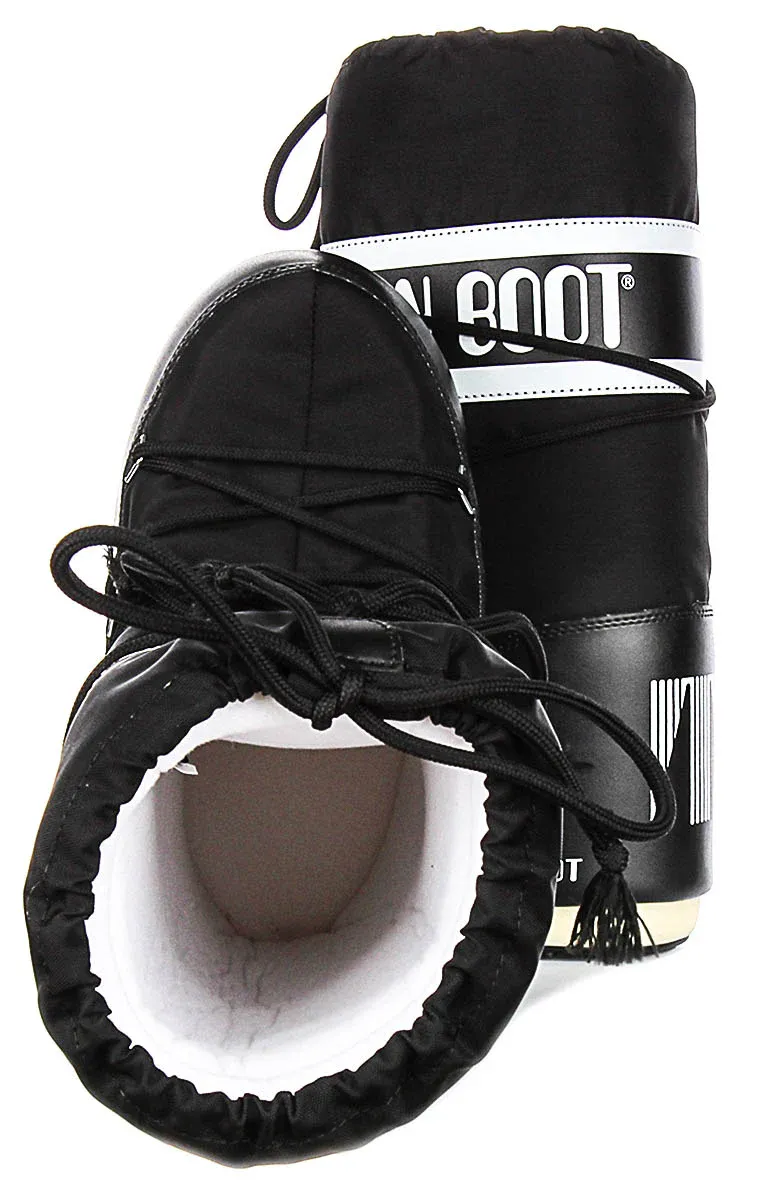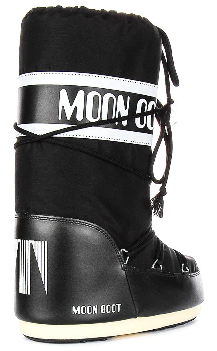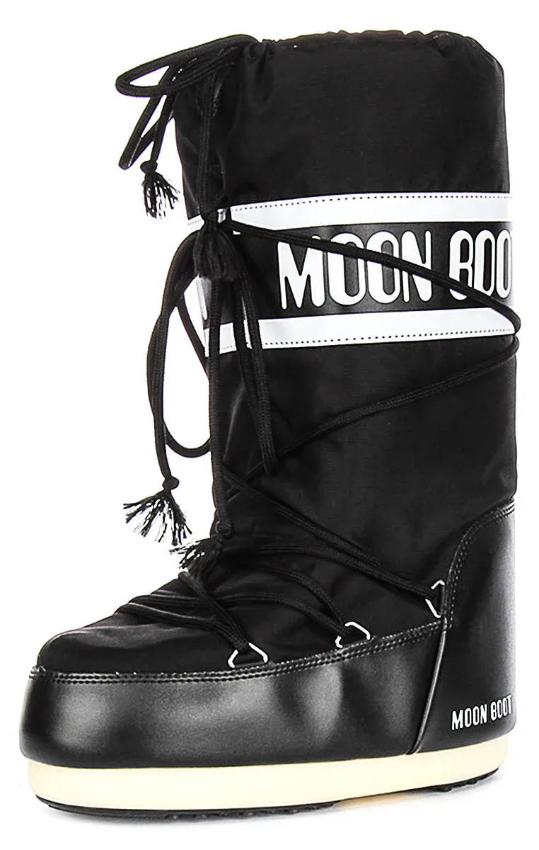 Constructed from durable nylon, the outer material offers excellent resistance against the elements, making these boots ideal for cold climate adventures. The sleek black design is accentuated by the iconic Moon Boot logo wrapped around the calf, adding a touch of boldness to their appearance.