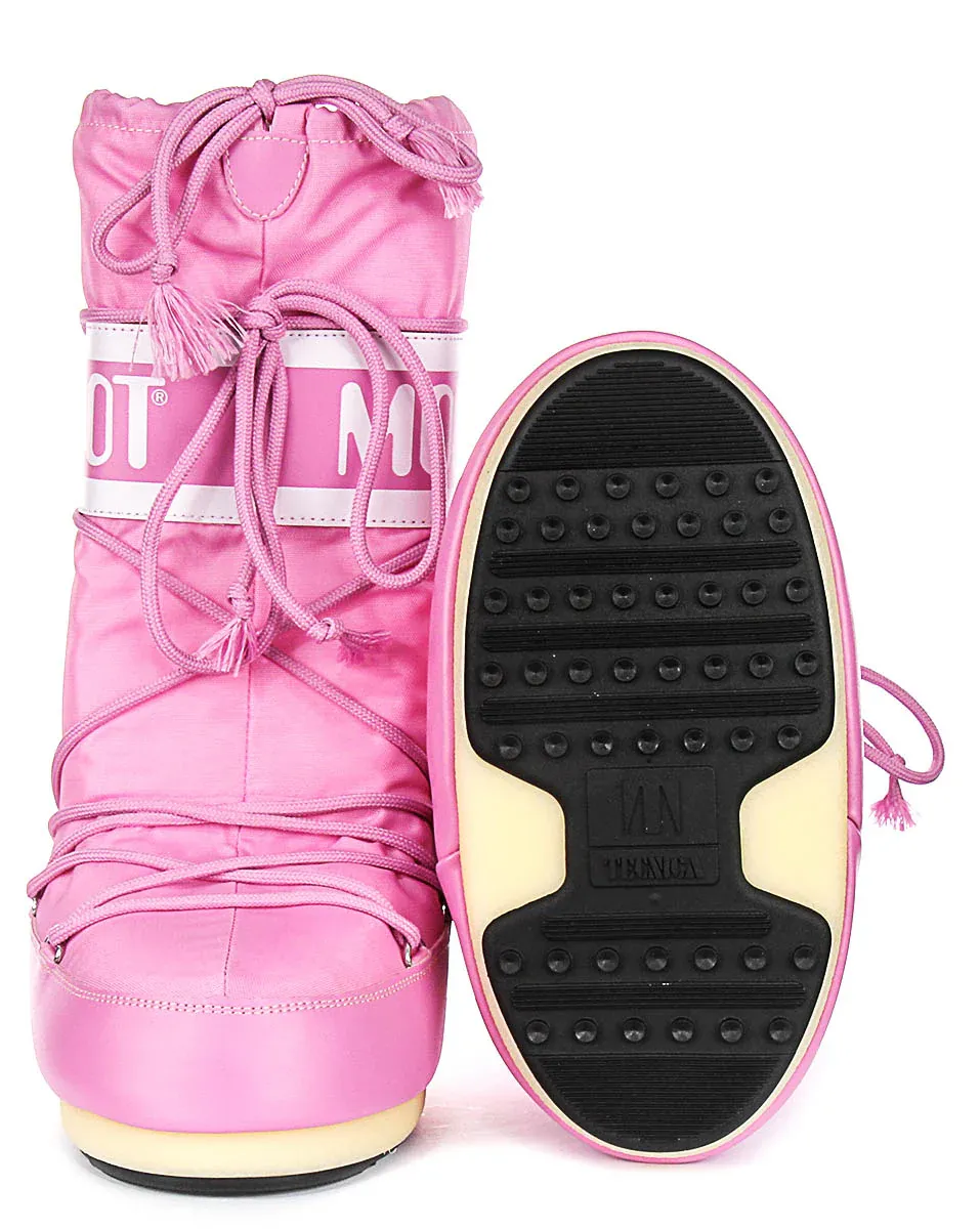 The Moon Boot Women’s Icon Nylon Mid Calf Boots are a striking addition to any winter wardrobe. Crafted by the renowned brand Moon Boot, these boots stand out with their vibrant pink colour and unique design, making them both functional and fashionable. The outer material is made from durable nylon, ensuring they are resistant to the elements, perfect for snowy or wet conditions.