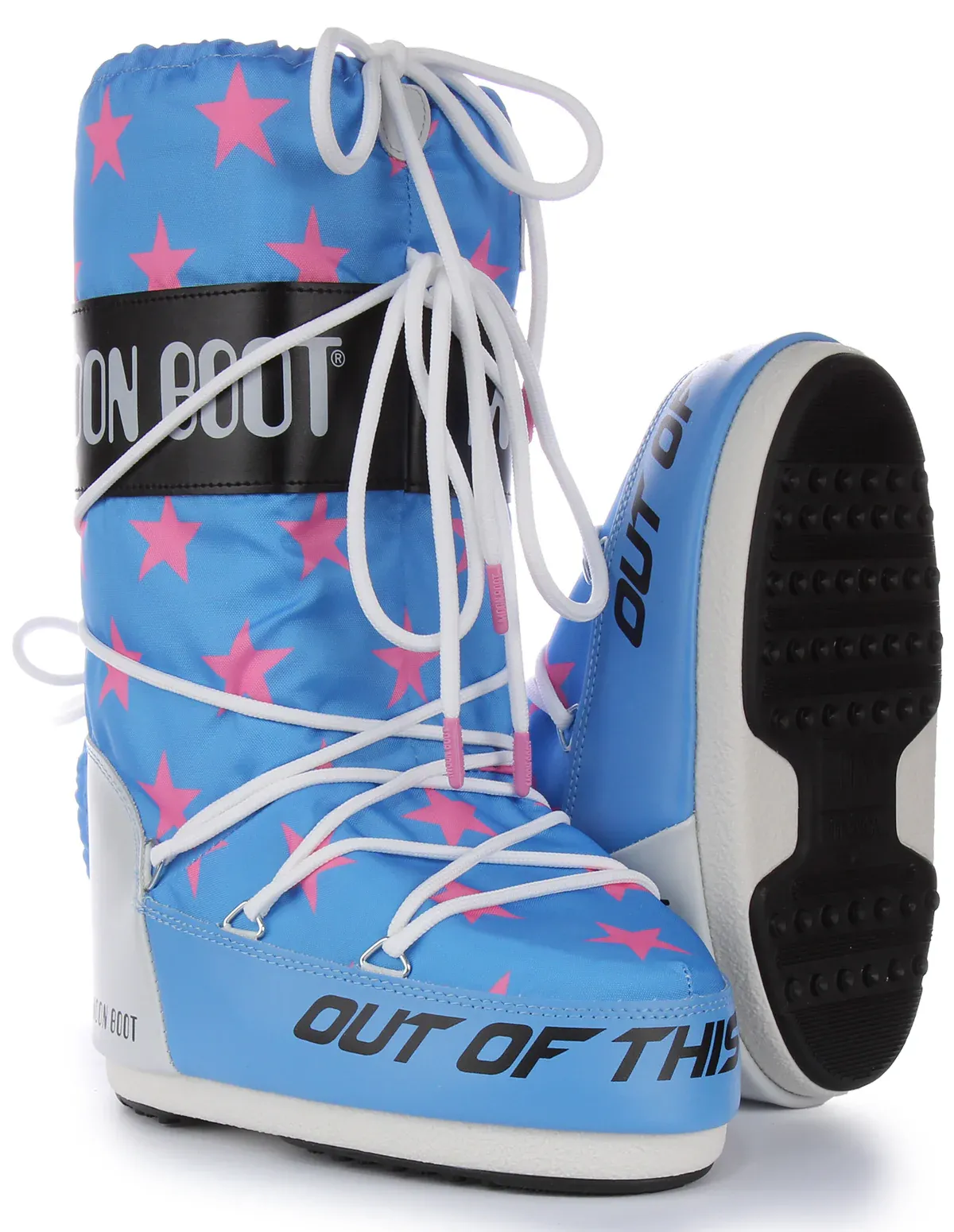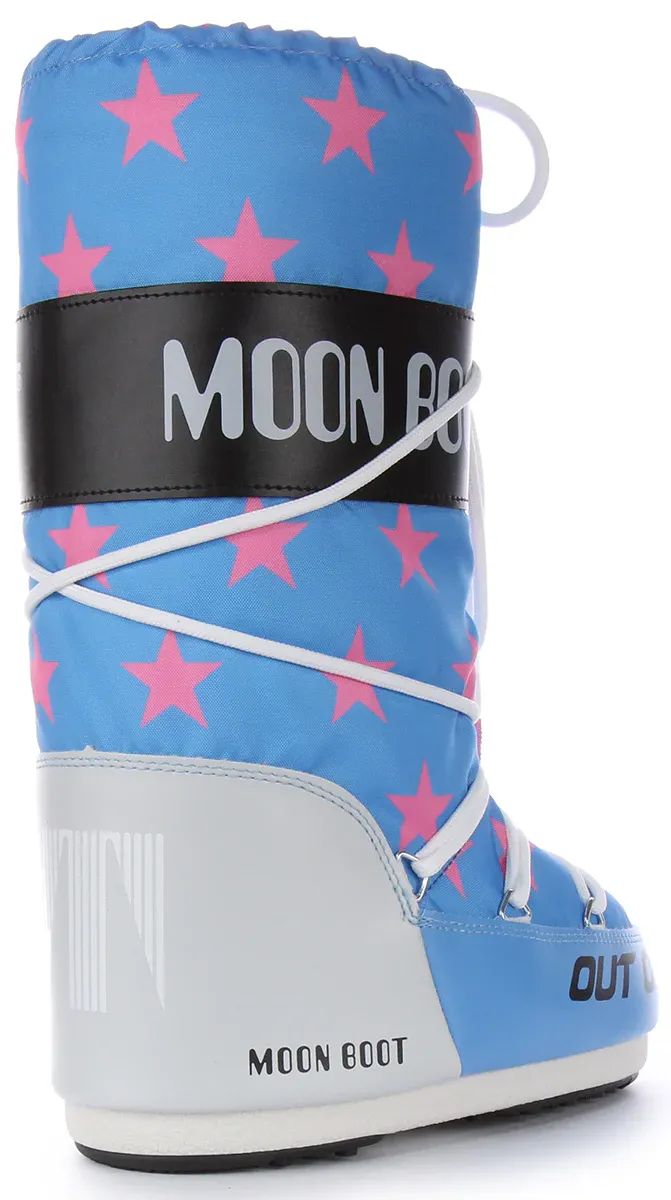 The Moon Boot Pink Stars Print Snow Boots for women redefine winter fashion with their enchanting Pink Stars Print and Mid Calf length. Crafted from highquality fabric, these boots offer the benefits of style and winter warmth. The playful star print adds a whimsical touch to snowy days.