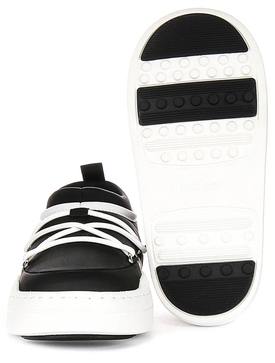 These trainers feature a striking contrast between the black nylon outer material and white detailing, including the laces and sole, creating a contemporary and eye-catching look. The lacing system is both functional and stylish, providing a secure fit while adding to the trainers’ overall aesthetic.