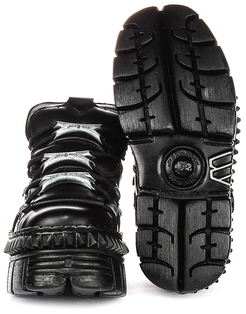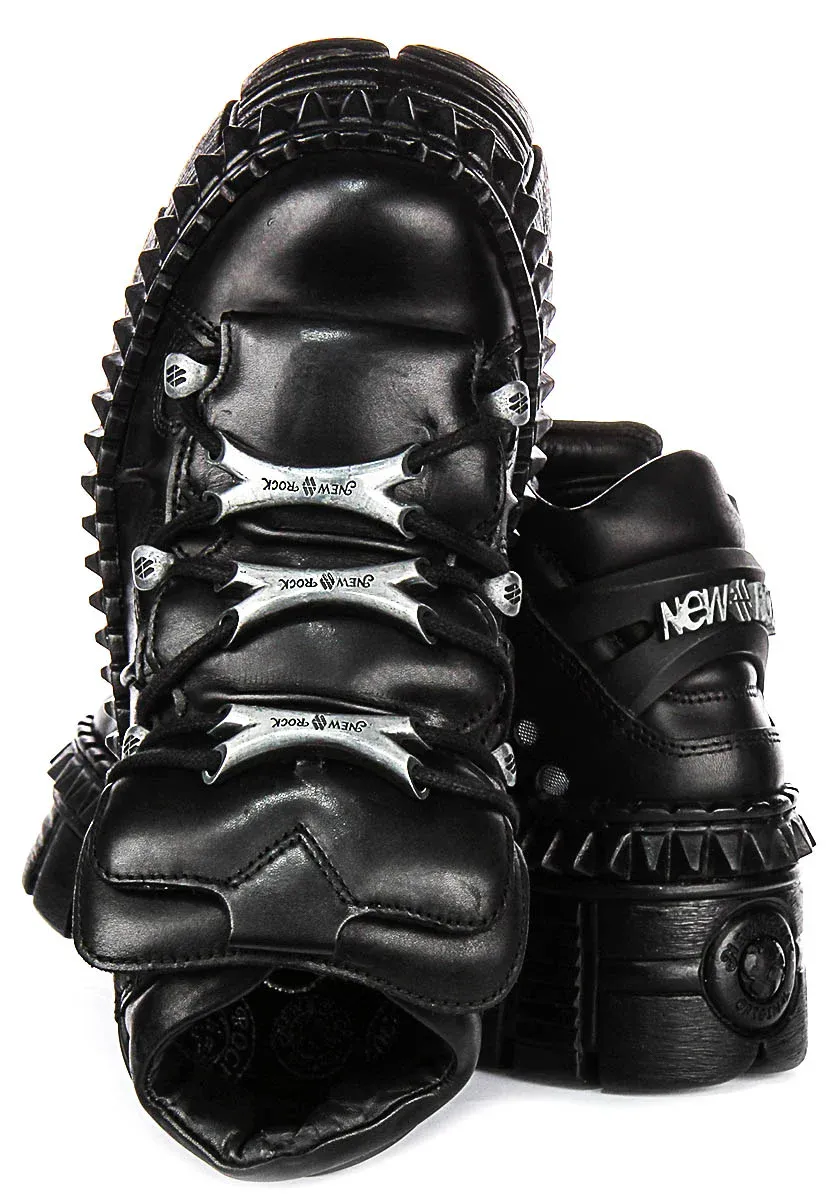 The Newrock 106 Wall platforms are a bold and striking footwear choice, ideal for those looking to make a statement. These unisex platforms are crafted from high-quality leather, ensuring both durability and a premium feel. The shoe’s outer material is predominantly black, providing a sleek and versatile look that can complement a variety of styles.