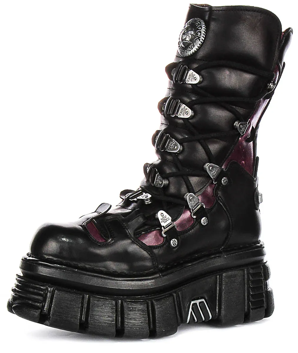 The 203 Tower boots boast an eye-catching design with their combination of black leather and subtle purple accents, creating a striking contrast. The robust design features multiple metal buckle-like accents running across the front, secured with black lacing for an adjustable fit. The metallic embellishments, including a signature round ornament on the tongue, add a gothic-industrial edge to the overall design. Additionally, the reinforced stitched overlay details elevate the aesthetic and ensure durability.