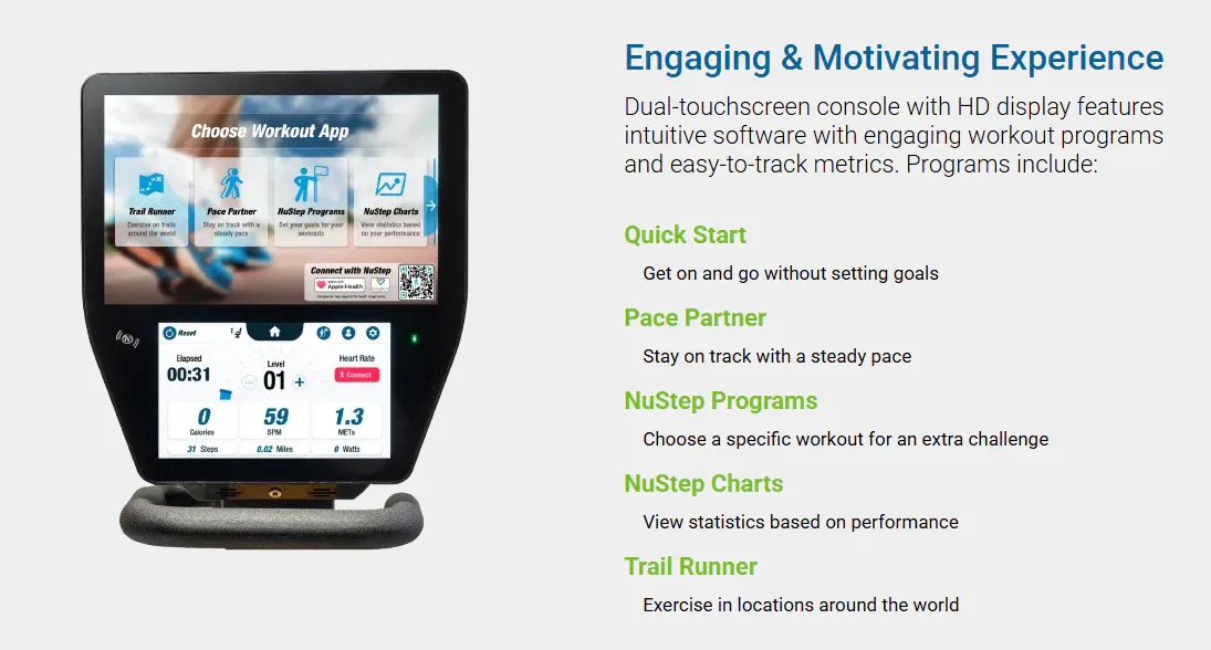 Dual-touchscreen console with HD display features intuitive software with engaging workout programs and easy-to-track metrics. Programs include: