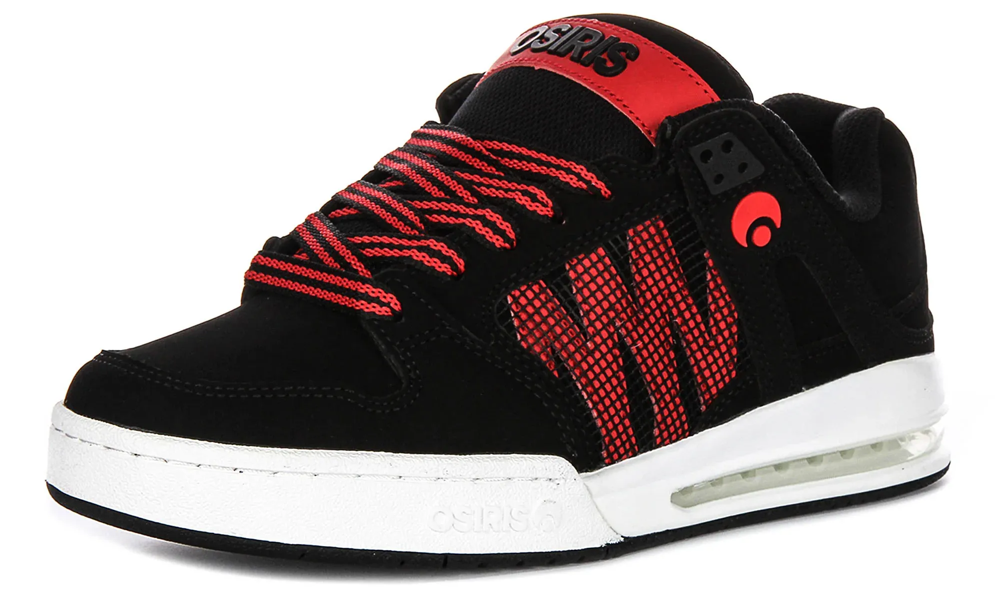 The trainers feature a black upper with striking red details, including a red woven lateral design, matching red accents, and coordinated laces that contrast vibrantly against the dark base. The Osiris branding on the tongue and rear heel panel further adds to the sleek and iconic look. These eye-catching details enhance the shoe’s visual appeal, making it a standout choice.