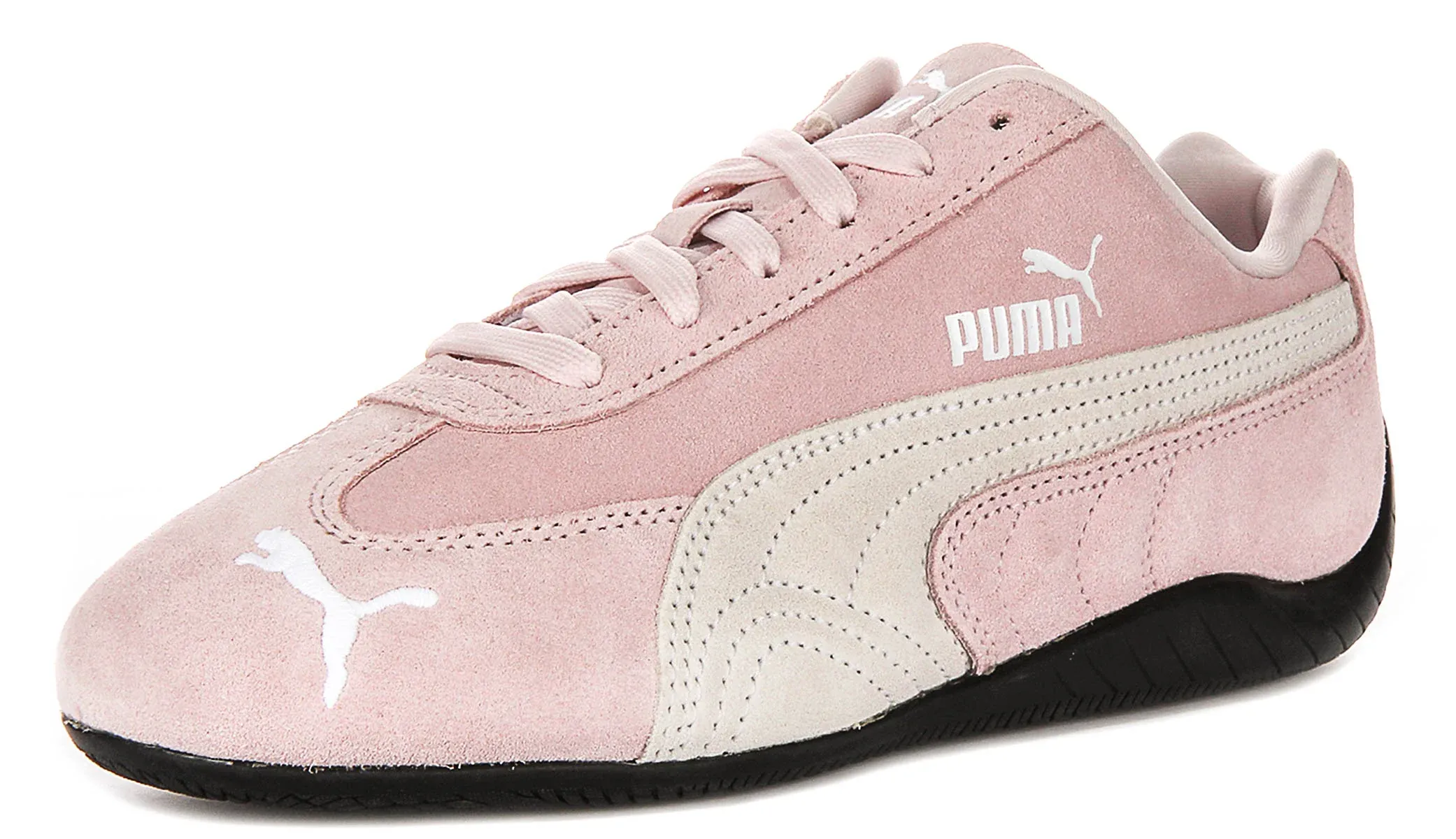 The outer material is beautifully constructed from premium suede leather, giving the trainers a soft and luxurious feel. This material not only adds to their sophisticated look but also ensures durability and flexibility, making them ideal for everyday wear. The elegant pale pink finish is complemented by contrasting white branding details, including the iconic Puma logo on the side and at the toe, which enhances their distinct and modern look.