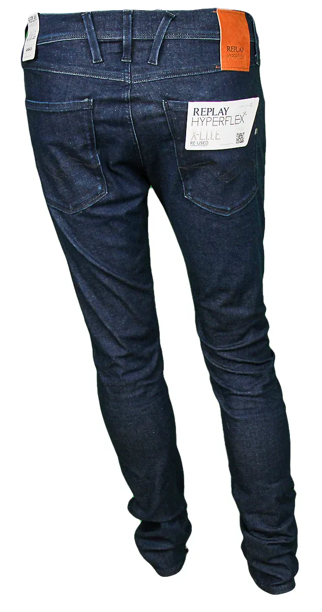 This Replay Anbass is men’s 5-pocket slim fit jeans featuring reform Hyperflex re-used denim, suitable for all occasions. It has regular waist, tapered leg, whiskers and scrapings, and zip and button closure. Finished with contemporary and clean look, this denim is made from recycled materials.