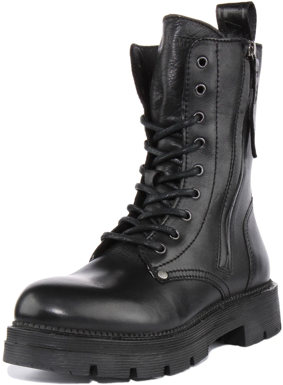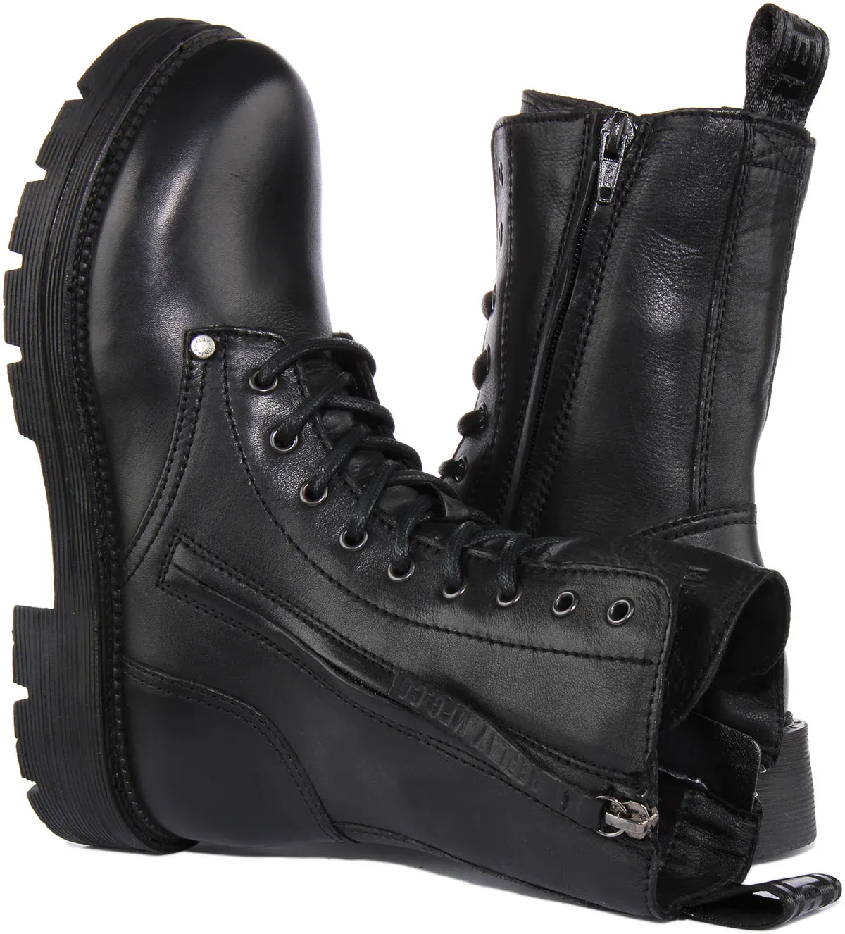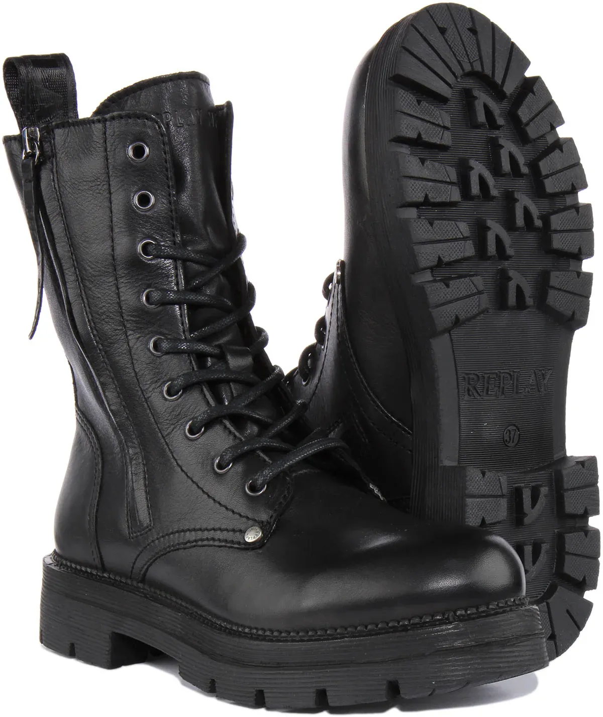 Cool lace up stylish biker inspired boots designed by Replay for women. It features premium leather upper. The lug sole provides extra traction and lace up closure provides a perfect fit. These boots have ornamental zipper on the outside and a functional one on the inside. Make a stylish shoe statement with these trendy, quality and quirky boots.