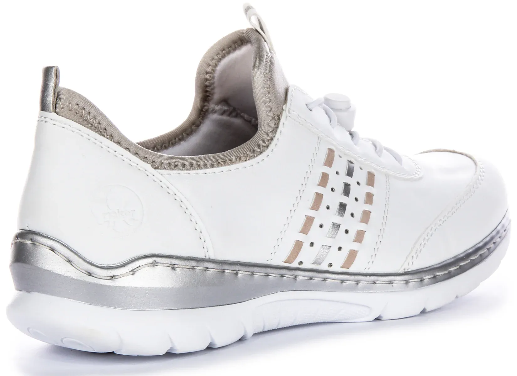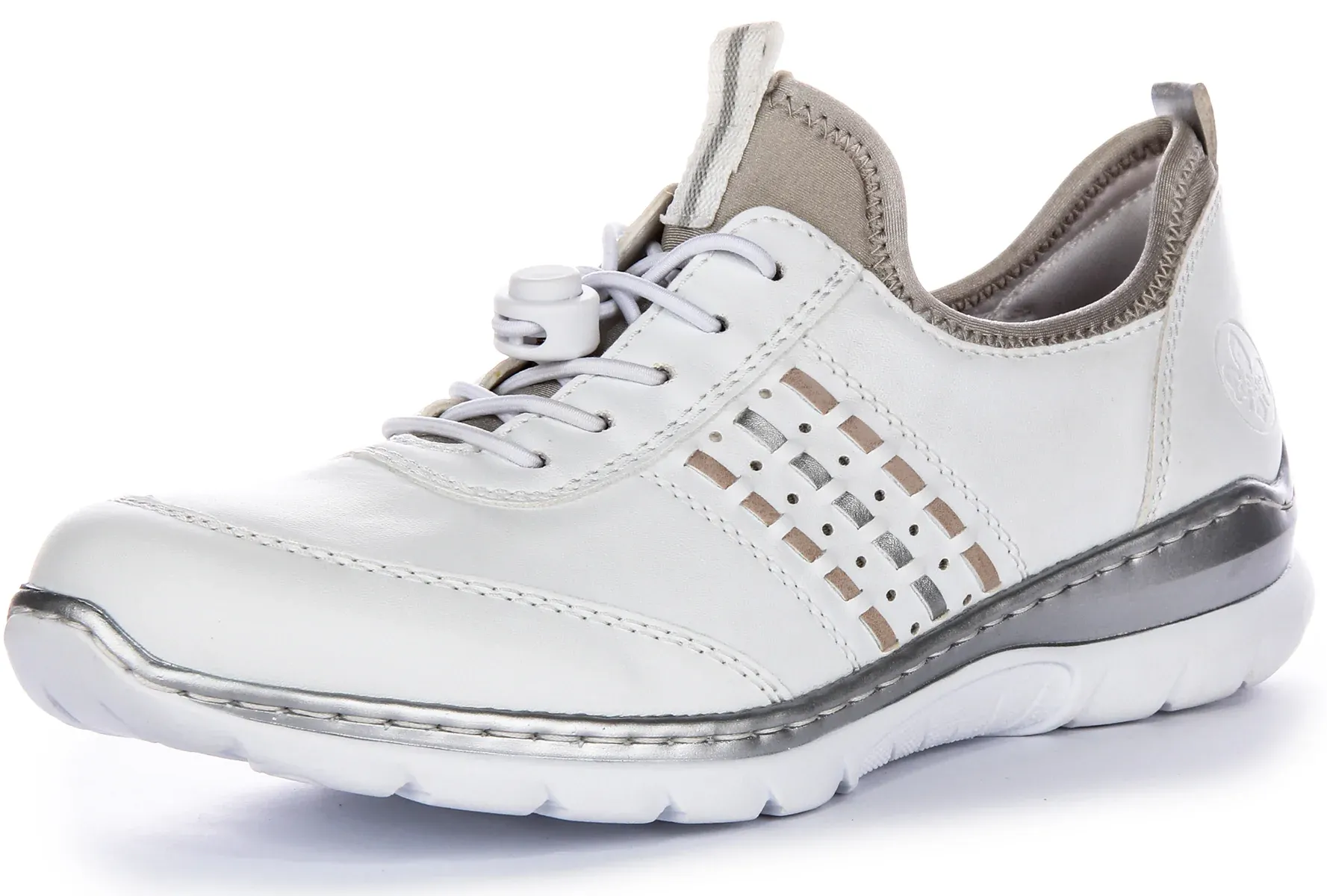 The white silver hue adds a touch of refinement, rendering them suitable for a myriad of occasions, from casual outings to formal gatherings.The elastic toggle laces not only ensure a snug fit but also adapt to the unique contours of the foot, delivering unmatched comfort.These shoes are a testament to Rieker’s commitment to combining style with functionality, making them an indispensable addition to any woman’s collection.Crafted from premium leather, these shoes not only promise longevity but also envelop the wearer in luxury.