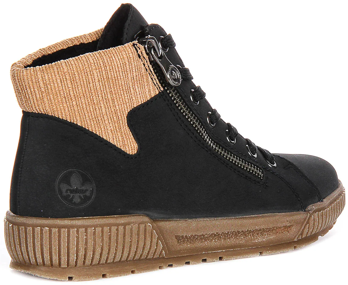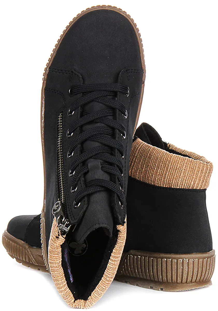 These ankle boots feature both a lace-up design and a convenient side zip, combining practicality with fashionable detailing. The sturdy rubber sole is textured for enhanced grip, making these boots suitable for various surfaces and weather conditions. The iconic Rieker logo subtly embossed on the side adds a touch of authenticity and brand recognition.