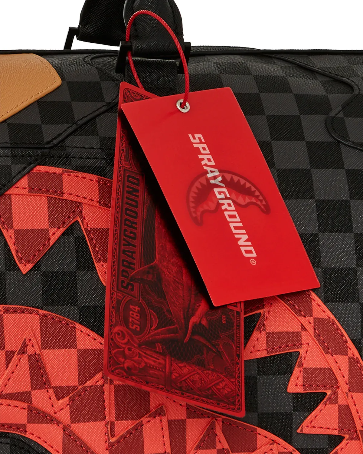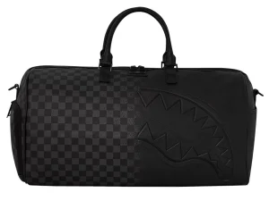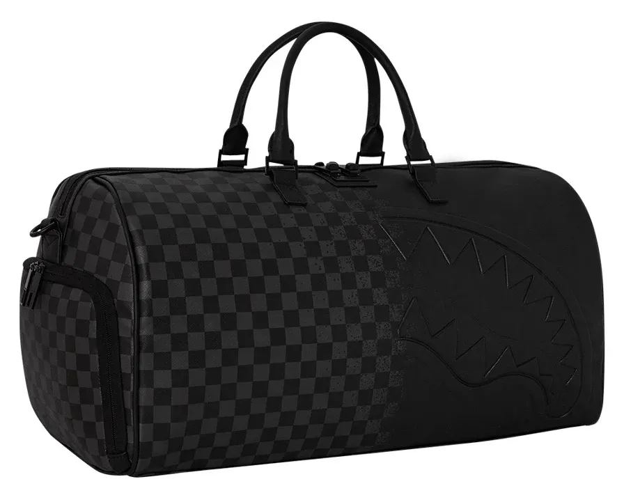 The Sprayground Unisex Synthetic Duffle Bag, model 910D6890NSZ, is a stylish and versatile accessory designed for all genders. It features a striking design with a black and grey checkerboard pattern on synthetic material. The bag is adorned with bold red shark teeth graphics, adding a unique and edgy flair to its appearance.