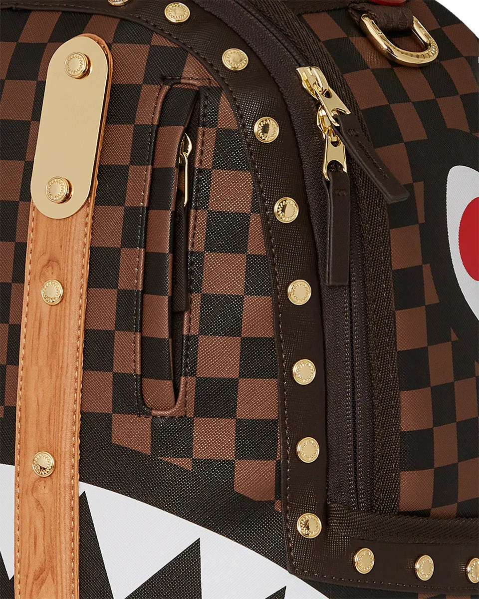 The exterior of the backpack features an eye-catching design with a bold checkerboard pattern intertwined with striking graphic elements. Embellished with gold-tone studs and accents, it adds a touch of luxury to the overall rugged look. Its innovative design not only stands out visually but also offers practicality, making it an ideal choice for various occasions, from school to travel.