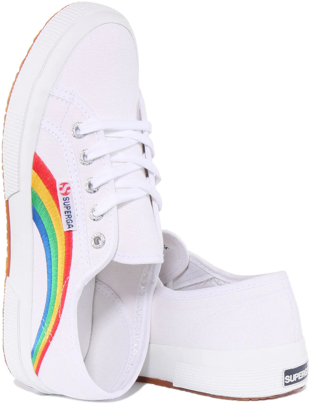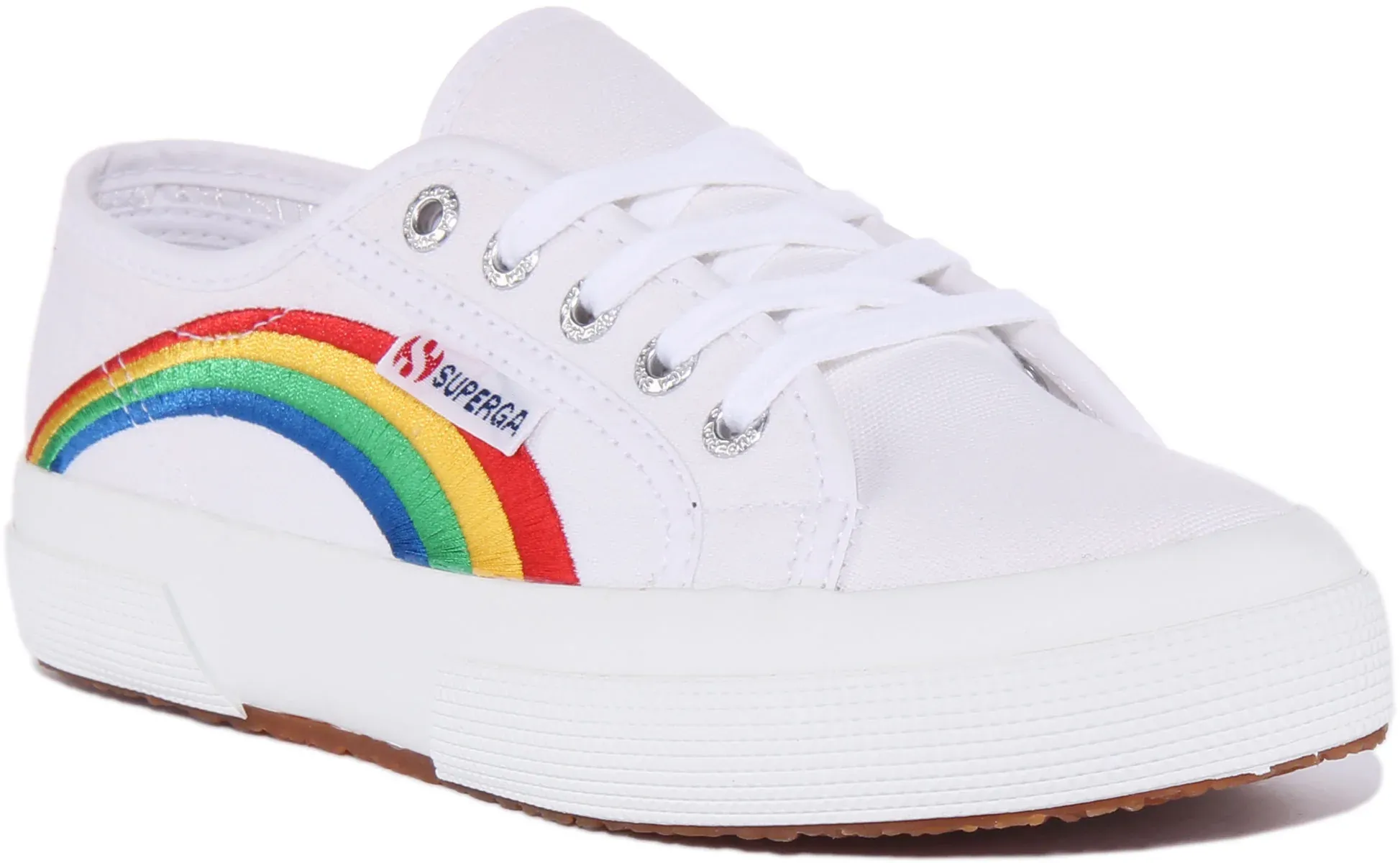 Express yourself with these classic kicks from Superga. These lace up trainers have a durable canvas upper with embroidered multicolor rainbow and cotton lining. The cushioned footbed provides all day comfort, while a crepe textured natural rubber outsole provides traction and durability. These shoes are machine washable. This is the staple shoe with full versatility, and is the very definition of smart casual.