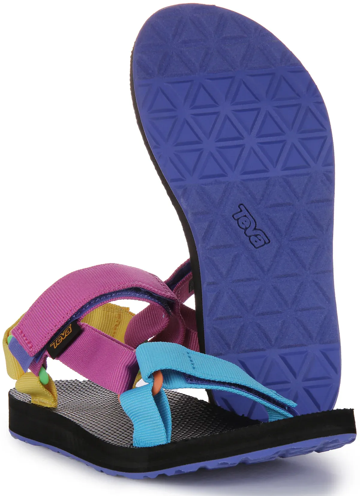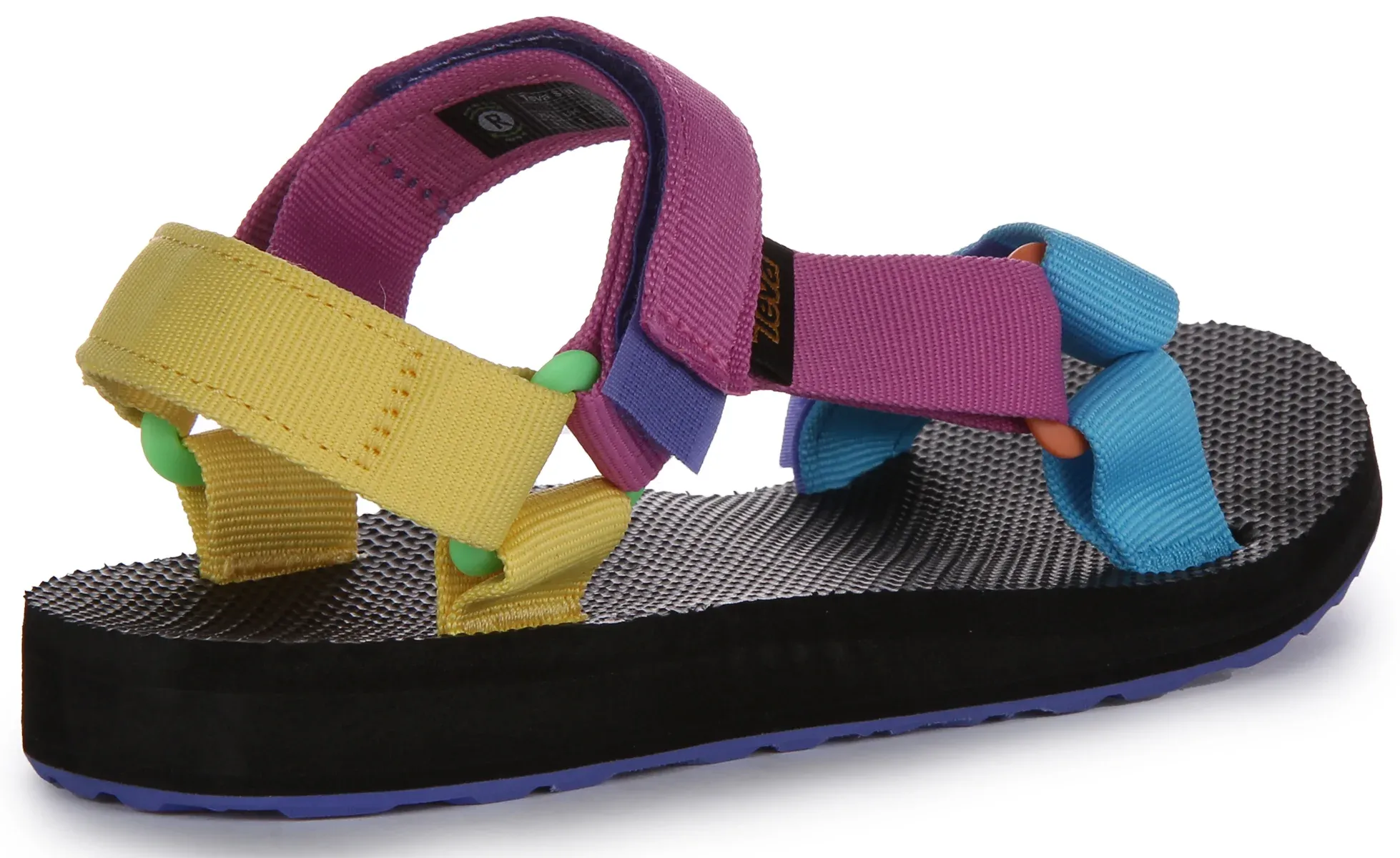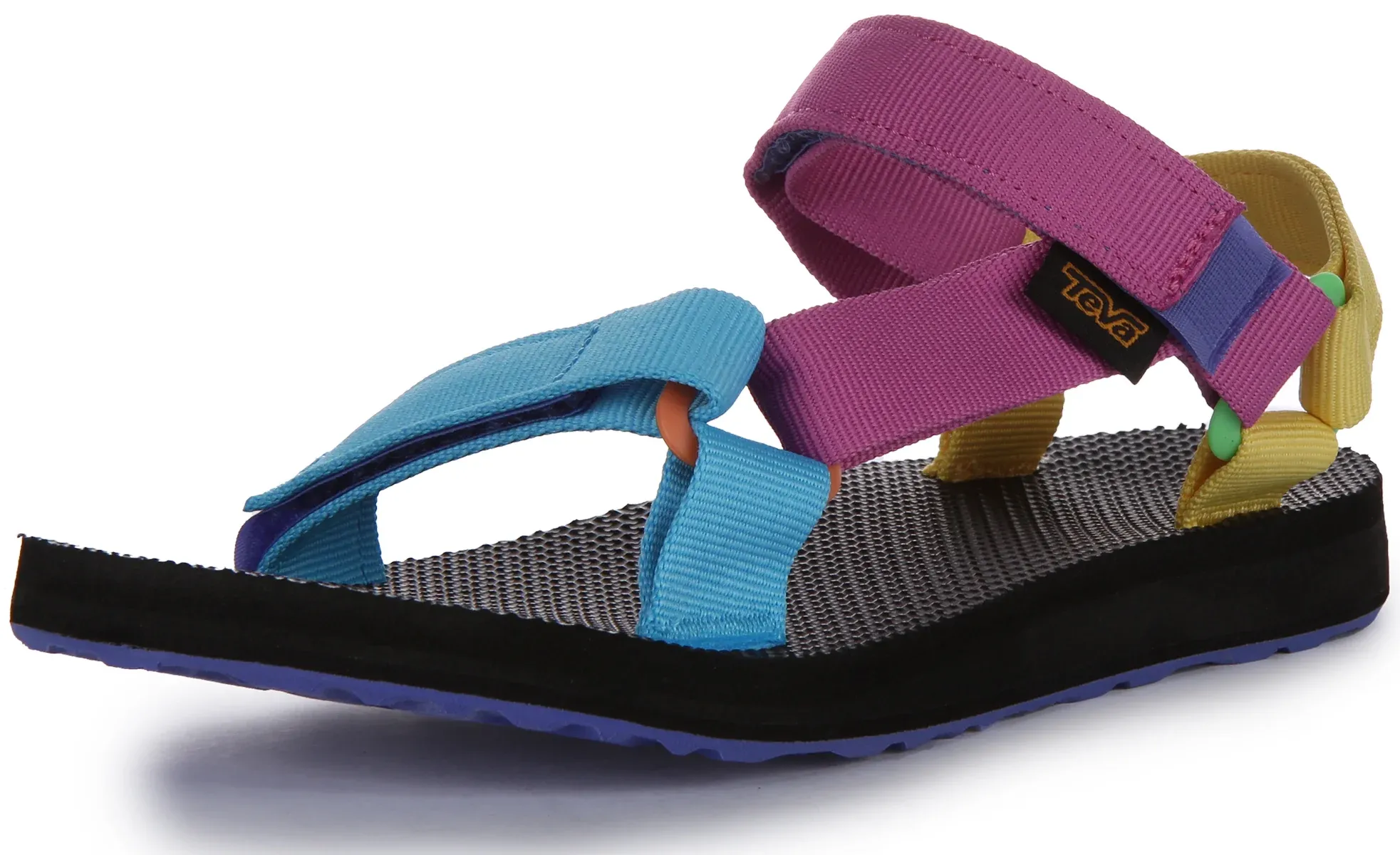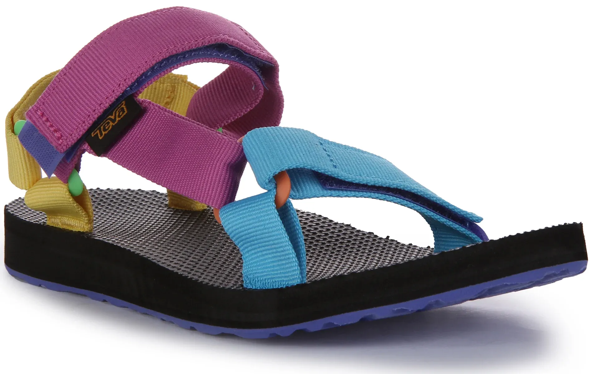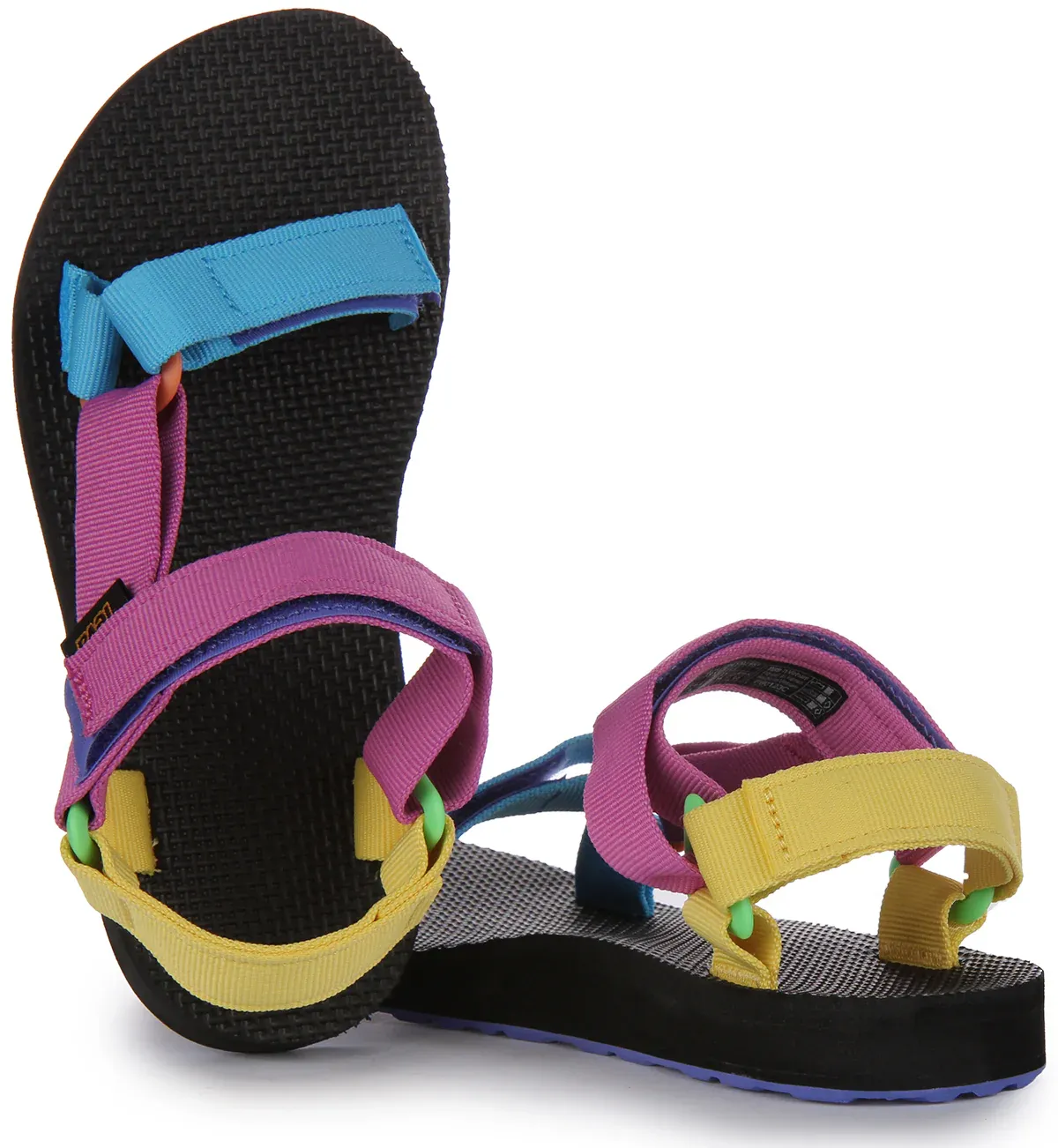The quick drying Teva Original Universal sandals offer comfort and keep pace with your active lifestyle. It is a vegan footwear created using synthetic and plant based materials. It features hook and loop closure for easy on/off, molded EVA midsole for added support and rubber outsole for durability and traction. An added microban treatment keeps smell at bay. Perfect sandals for water activities or for all day wear.