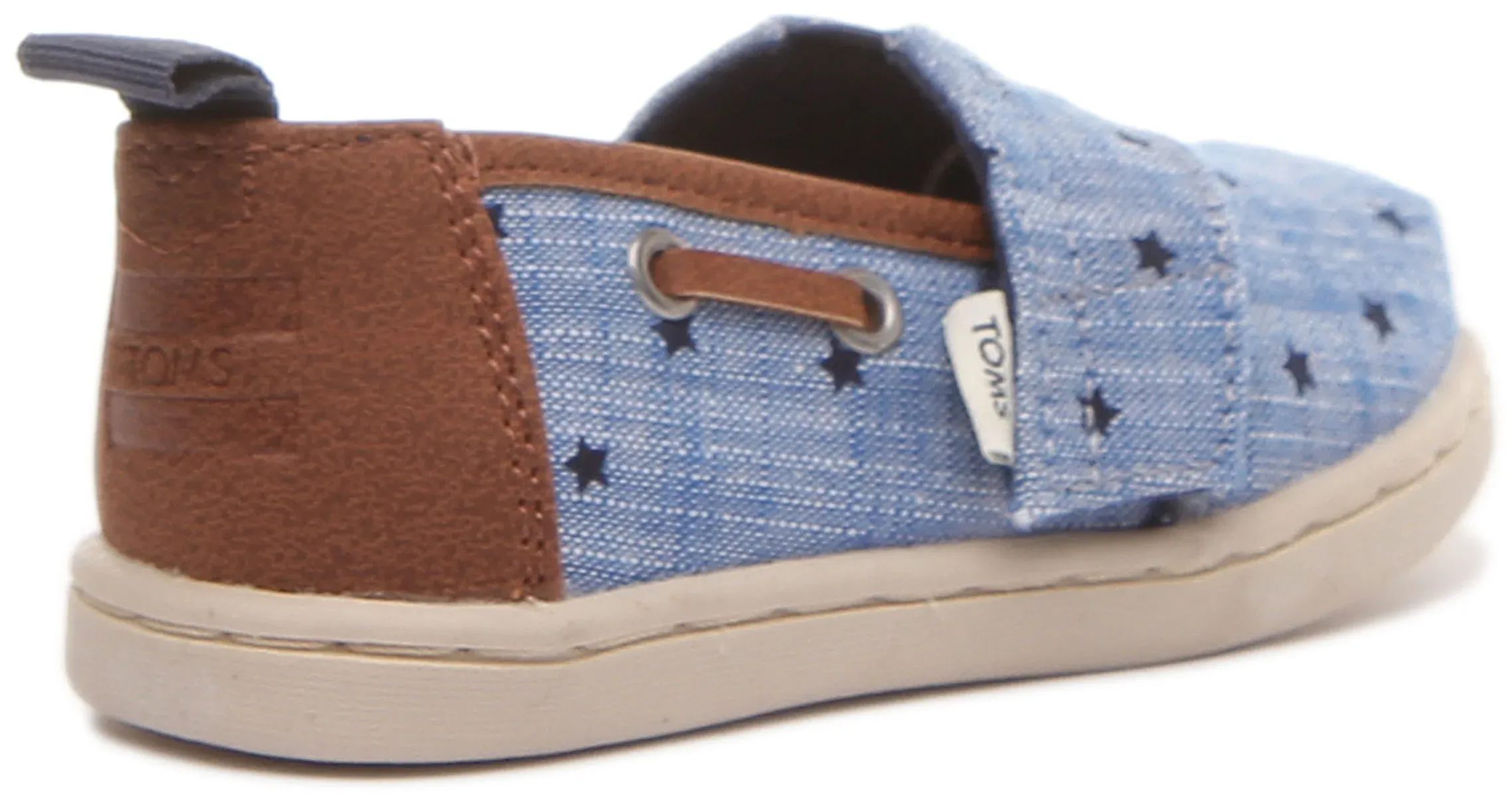 This is Toms original classic style redesigned for tiny feet with stars printed canvas upper. Adjustable front strap makes these shoes even easier to get on and off of fidgety little feet. It also features rubber outsole that provides stability and traction. Perfect lightweight trainers for your kidÂ’s tiny feet.