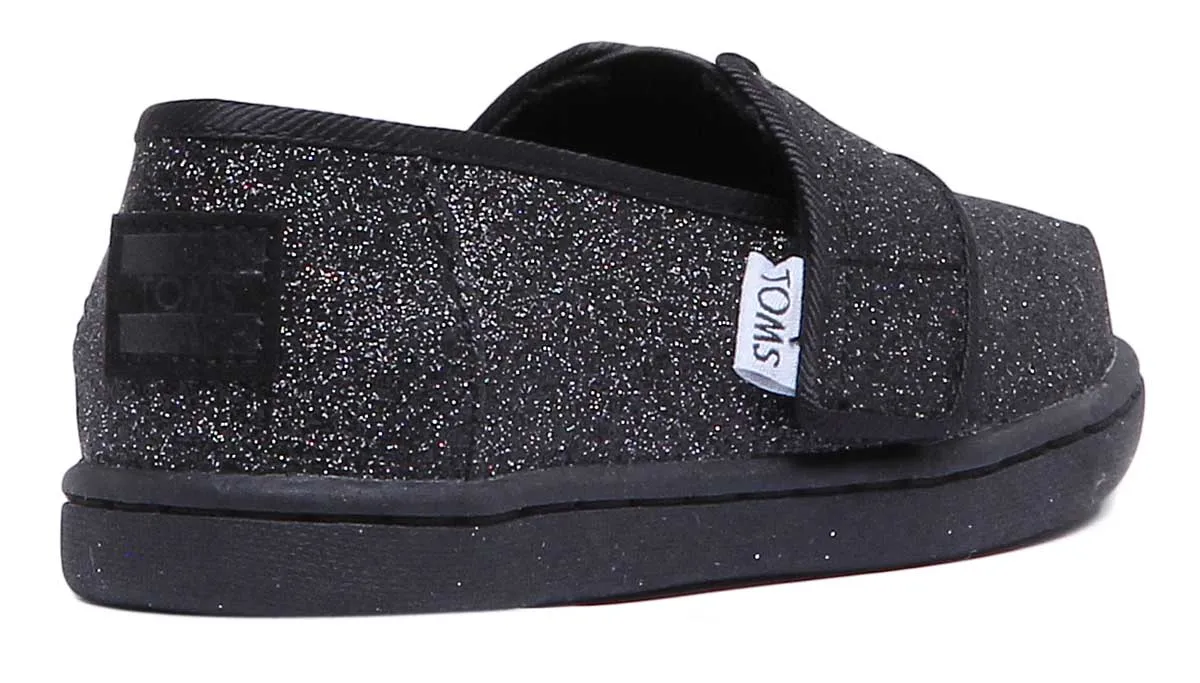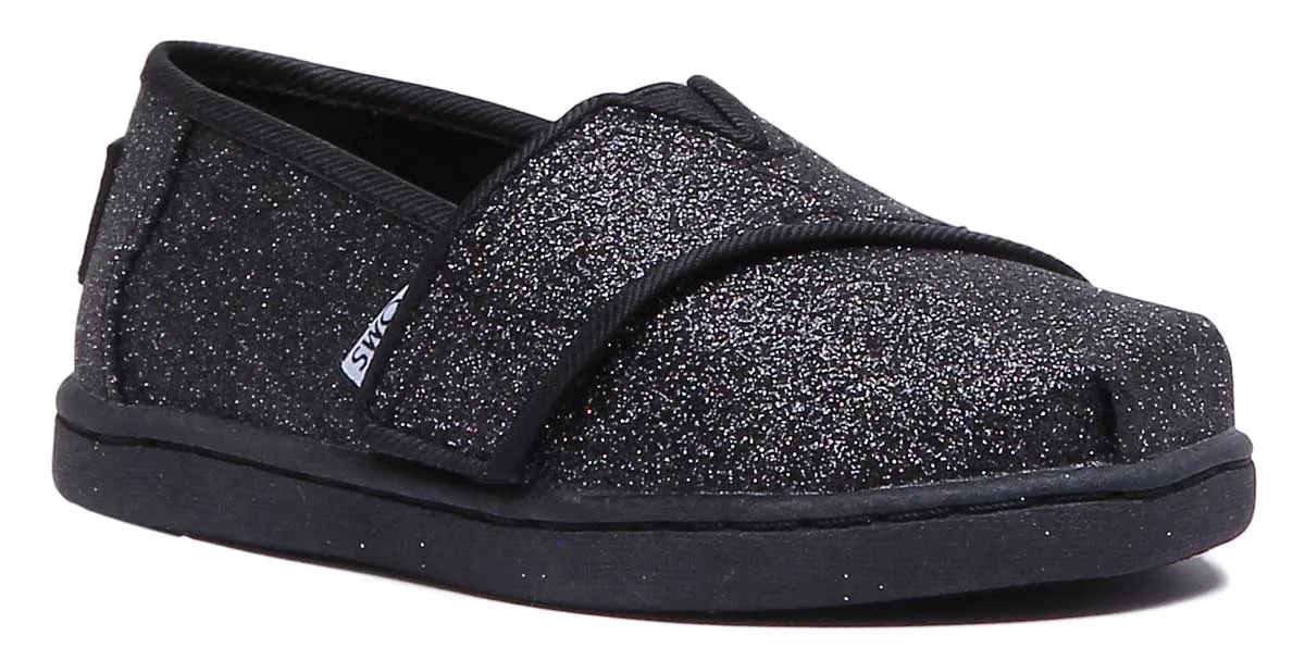 Keep your kids unstoppable in the all-day comfort and no-slip traction of these Toms classic alpargatas. Plus, watch their shoes sparkle with this special glitter fabric. Made from the combination of textile and synthetic upper, these sneakers feature hook and loop strap closure and rubber outsole for flexibility and durability. It also comes with classic elastic V-notch for easy on and off.